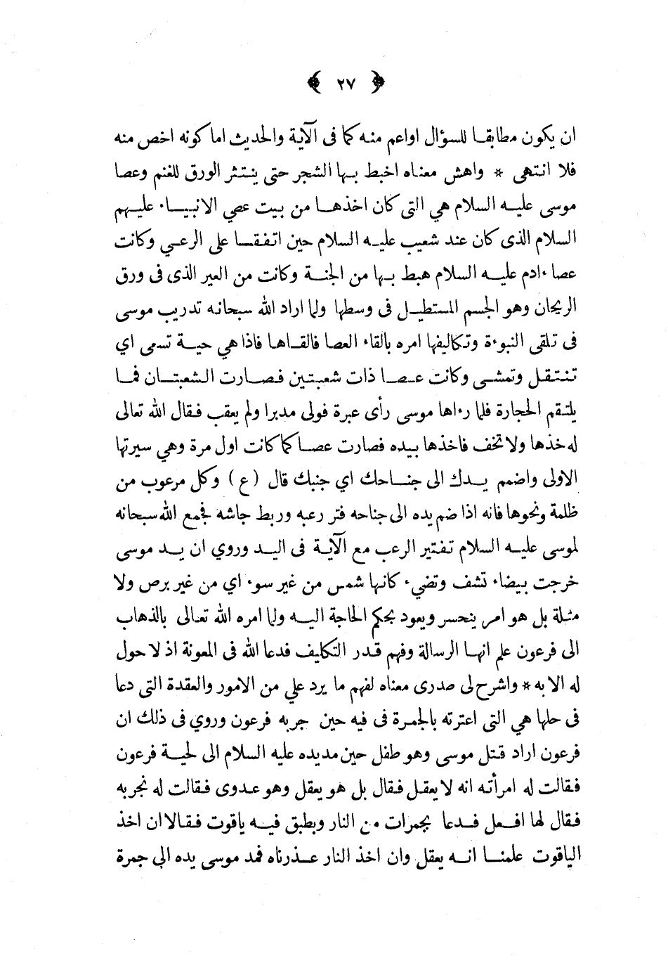 أن يكون مطابقا للسؤال أو أعم منه كما في الآية والحديث أما كونه أخص منه فلا انتهى وأهش معناه أخبط بها الشجر حتى ينتثر الورق للغنم وعصا موسى عليه السلام هي التي كان أخذها من بيت عصي الأنبياء عليهم السلام الذي كان عند شعيب عليه السلام حين اتفقا على الرعي وكانت عصا آدم عليه السلام هبط بها من الجنة وكانت من العير الذي في ورق الريحان وهو الجسم المستطيل في وسطها ولما أراد الله سبحانه تدريب موسى في تلقي النبوة وتكاليفها أمره بإلقاء العصا فألقاها فإذا هي حية تسعى أي تنتقل وتمشي وكانت عصا ذات شعبتين فصارت الشعبتان فما يلتقم الحجارة فلما رءاها موسى رأى عبرة فولى مدبرا ولم يعقب فقال الله تعالى له خذها ولا تخف فأخذها بيده فصارت عصا كما كانت أول مرة وهي سيرتها الأولى واضمم يدك إلى جناحك أي جنبك قال ع وكل مرعوب من ظلمة ونحوها فإنه إذا ضم يده إلى جناحه فتر رعبه وربط جأشه فجمع الله سبحانه لموسى عليه السلام تفتير الرعب مع الآية في اليد وروي أن يد موسى خرجت بيضاء تشف وتضيء كأنها شمس من غير سوء أي من غير برص ولا مثله بل هو أمر ينحسر ويعود بحكم الحاجة إليه ولما أمره الله تعالى بالذهاب إلى فرعون علم أنها الرسالة وفهم قدر التكليف فدعا الله في المعونة إذ لا حول له إلا به واشرح لي صدري معناه لفهم ما يرد علي من الأمور والعقدة التي دعا في حلها هي التي اعترته بالجمرة في فيه حين جربه فرعون وروي في ذلك أن فرعون أراد قتل موسى وهو طفل حين مد يده عليه السلام إلى لحية فرعون فقالت له امرأته أنه لا يعقل فقال بل هو يعقل وهو عدوي فقالت له نجربه فقال لها أفعل فدعا بجمرات من النار وبطبق فيه ياقوت فقالا إن أخذ الياقوت علمنا إنه يعقل وإن أخذ النار عذرناه فمد موسى يده إلى جمرة