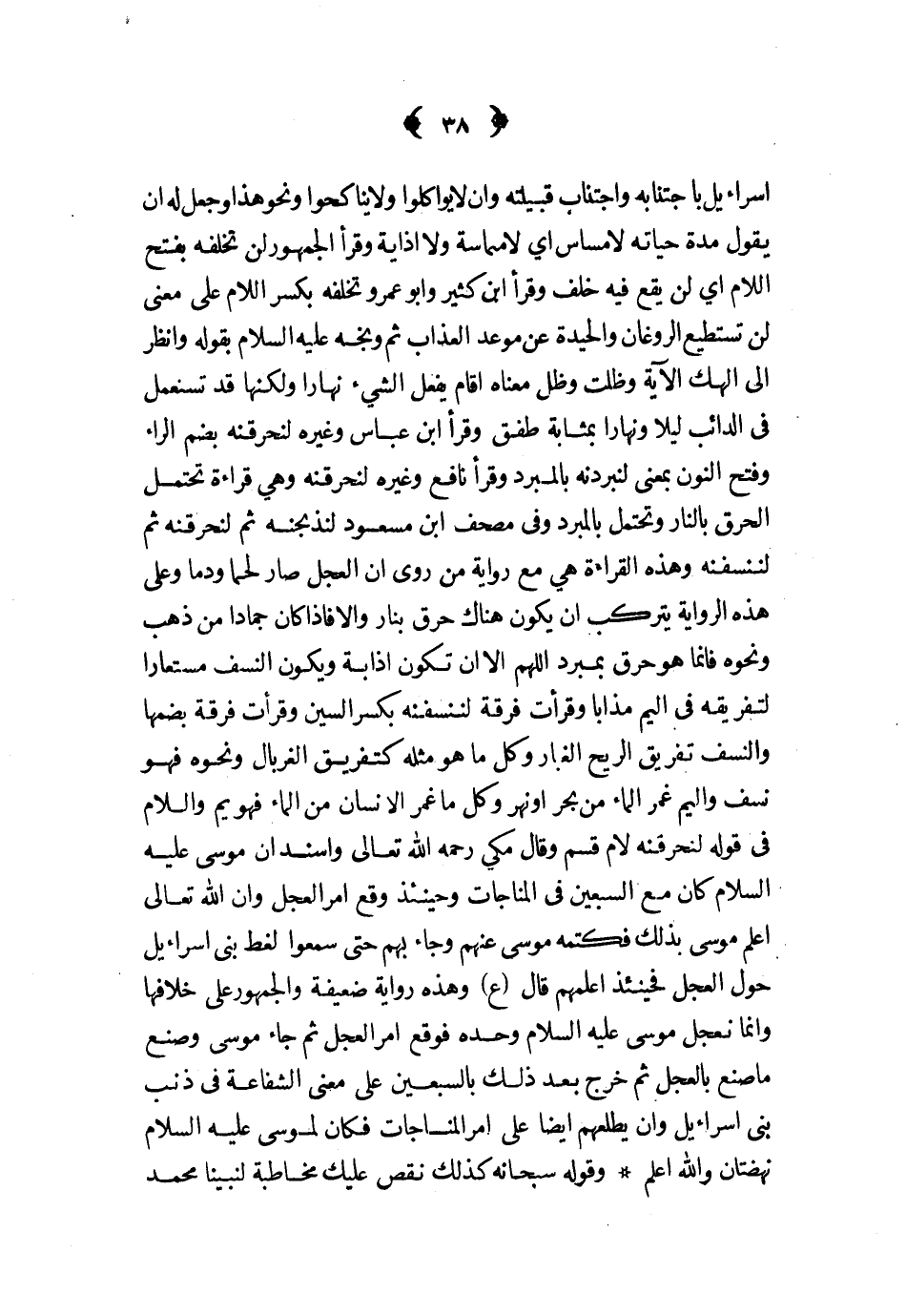 إسرائيل باجتنابه واجتناب قبيلته وأن لا يواكلوا ولا يناكحوا ونحو هذا وجعل له أن يقول مدة حياته لا مساس أي لا مماسة ولا إذاية وقرأ الجمهور لن تخلفه بفتح اللام أي لن يقع فيه خلف وقرأ ابن كثير وأبو عمرو تخلفه بكسر اللام على معنى لن تستطيع الروغان والحيدة عن موعد العذاب ثم وبخه عليه السلام بقوله وأنظر إلى الهك الآية وظلت وظل معناه أقام يفعل الشيء نهارا ولكنها قد تستعمل في الدائب ليلا ونهارا بمثابة طفق وقرأ ابن عباس وغيره لنحرقنه بضم الراء وفتح النون بمعنى لنبردنه بالمبرد وقرأ نافع وغيره لنحرقنه وهي قراءة تحتمل الحرق بالنار وتحتمل بالمبرد وفي مصحف ابن مسعود لنذبحنه ثم لنحرقنه ثم لننسفنه وهذه القراءة هي مع رواية من روى أن العجل صار لحما ودما وعلى هذه الرواية يتركب أن يكون هناك حرق بنار وإلا فإذا كان جمادا من ذهب ونحوه فإنما هو حرق بمبرد اللهم إلا أن تكون إذابة ويكون النسف مستعارا لتفريقه في اليم مذابا وقرأت فرقة لننسفنه بكسر السين وقرأت فرقة بضمها والنسف تفريق الريح الغبار وكل ما هو مثله كتفريق الغربال ونحوه فهو نسف واليم غمر الماء من بحر أو نهر وكل ما غمر الإنسان من الماء فهو يم واللام في وقوله لنحرقنه لام قسم وقال مكي رحمه الله تعالى وأسند أن موسى عليه السلام كان مع السبعين في المناجات وحينئذ وقع أمر العجل وأن الله تعالى أعلم موسى بذلك فكتمه موسى عنهم وجاء بهم حتى سمعوا لغط بني إسرائيل حول العجل فحينئذ أعلمهم قال ع وهذه رواية ضعيفة والجمهور على خلافها وإنما نعجل موسى عليه الصلام وحده فوقع أمرا العجل ثم جاء موسى وصنع ما صنع بالعجل ثم خرج بعد ذلك بالسبعين على معنى الشفاعة في ذنب بني اسراءيل وأن يطلعهم أيضا على أمر المناجات فكان لموسى عليه السلام نهضتان والله أعلم وقوله سبحانه كذلك نقص عليك مخاطبة لنبينا محمد