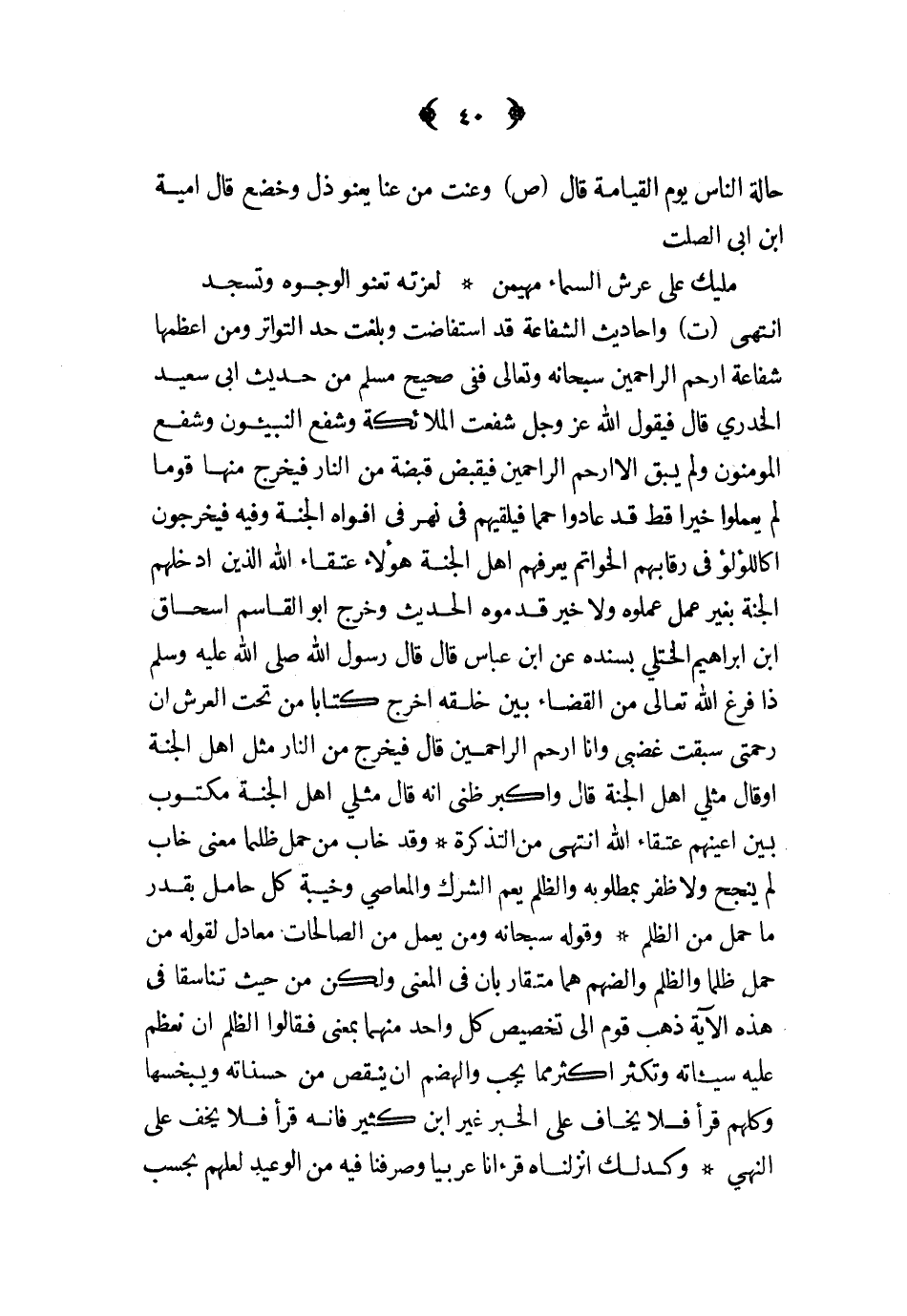 انتهى ت - وأحاديث الشفاعة قد استفاضت وبلغت حد التواتر ومن أعظمها شفاعة أرحم الراحمين سبحانه وتعالى ففي صحيح مسلم من حديث أبي سعيد الخدري قال فيقول الله عز و جل شفعت الملائكة وشفع النبيون وشفع المؤمنون ولم يبق إلا أرحم الراحمين فيقبض قبضة من النار فيخرج منها قوما لم يعملوا خيرا قط قد عادوا حمما فيلقيهم في نهر في أفواه الجنة وفيه فيخرجون كاللؤلؤ في رقابهم الخواتم يعرفهم أهل الجنة هؤلاء عتقاء الله الذين أدخلهم الجنة بغير عمل عملوه ولا خير قدموه الحديث وخرج أبو القاسم إسحاق ابن إبراهيم الختلي بسنده عن ابن عباس قال قال رسول الله صلى الله عليه و سلم