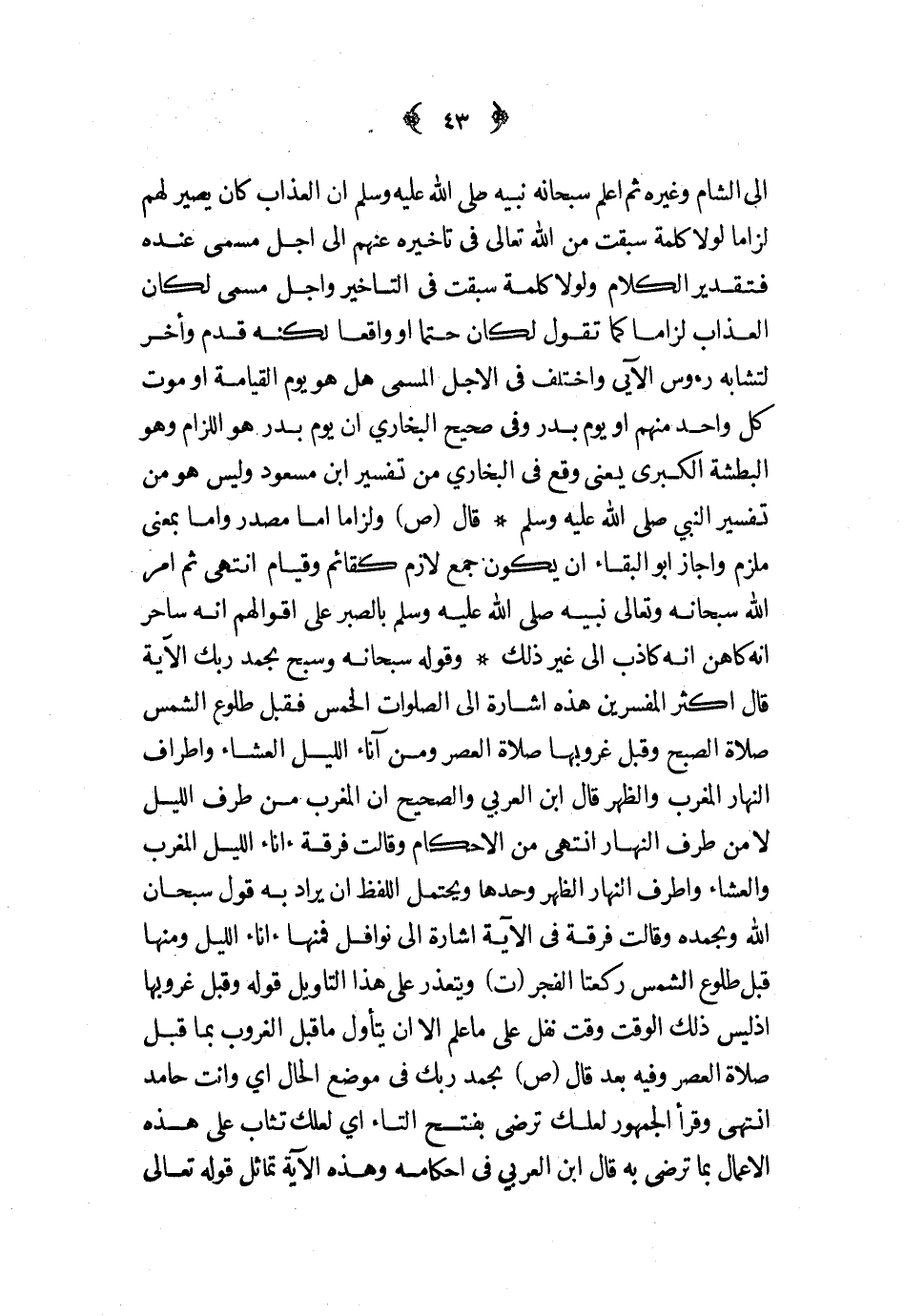 إلى الشام وغيره ثم أعلم سبحانه نبيه صلى الله عليه و سلم أن العذاب كان يصير لهم لزاما لولا كلمة سبقت من الله تعالى في تأخيره عنهم إلى أجل مسمى عنده فتقدير الكلام ولولا كلمة سبقت في التأخير وأجل مسمى لكان العذاب لزاما كما تقول لكان حتما أو واقعا لكنه قدم وآخر لتشابه رؤوس الآيي واختلف في الأجل المسمى هل هو يوم القيامة أو موت كل واحد منهم أو يوم بدر وفي صحيح البخاري أن يوم بدر هو اللزام وهو البطشة الكبرى يعني وقع في البخاري من تفسير ابن مسعود وليس هو من تفسير النبي صلى الله عليه و سلم قال ص - ولزاما أما مصدر وأما بمعنى ملزم وأجاز أبو البقاء أن يكون جمع لازم كقائم وقيام انتهى ثم أمر الله سبحانه وتعالى نبيه صلى الله عليه و سلم بالصبر على أقوالهم أنه ساحر أنه كاهن أنه كاذب إلى غير ذلك