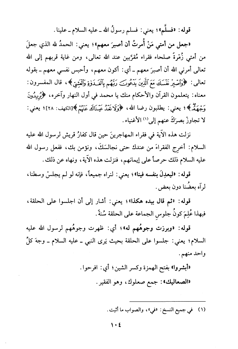 "جعل من أمتي مَنْ أُمرتُ أن أصبرَ معهم"؛ يعني: الحمدُ لله الذي جعلَ من أمتي زُمْرةً صلحاء فقراء مُقرَّبين عند الله تعالى، ومن غاية قربهم إلى الله تعالى أمرني الله أن أصبرَ معهم - أي: أكون معهم، وأحبس نفسي معهم - بقوله تعالى: {وَاصْبِرْ نَفْسَكَ مَعَ الَّذِينَ يَدْعُونَ رَبَّهُمْ بِالْغَدَاةِ وَالْعَشِيِّ}، قال المفسرون: معناه: يتعلمون القرآن والأحكام منك يا محمد في أول النهار وآخره، {يُرِيدُونَ وَجْهَهُ}؛ يعني: يطلبون رضا الله، {وَلَا تَعْدُ عَيْنَاكَ عَنْهُمْ} [الكهف: 28]؛ يعني: لا تجاوزْ بصرَكَ عنهم إلى (¬1) الأغنياء.
