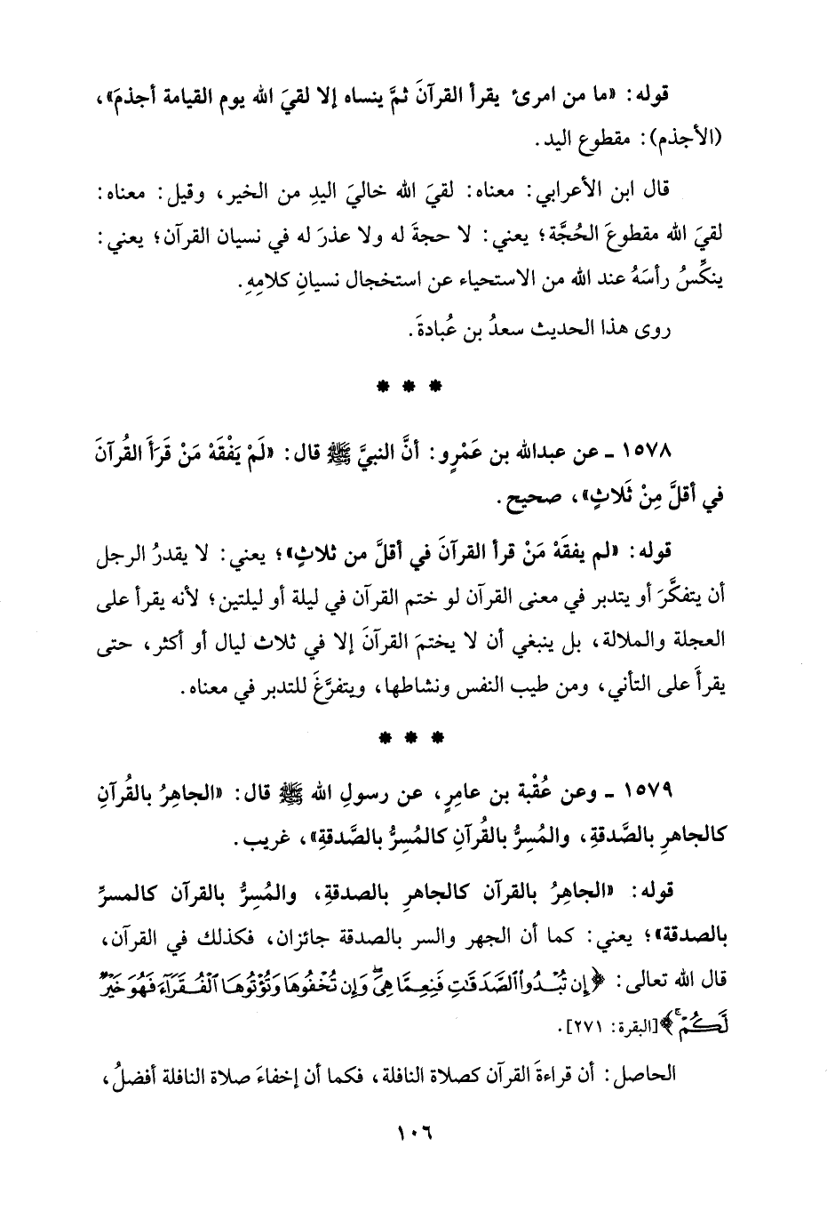 1578 - عن عبد الله بن عَمْرٍو: أنَّ النبيَّ - صلى الله عليه وسلم - قال: "لَمْ يَفْقَهْ مَنْ قَرَأَ القُرآنَ في أقلَّ مِنْ ثَلاثٍ"، صحيح.