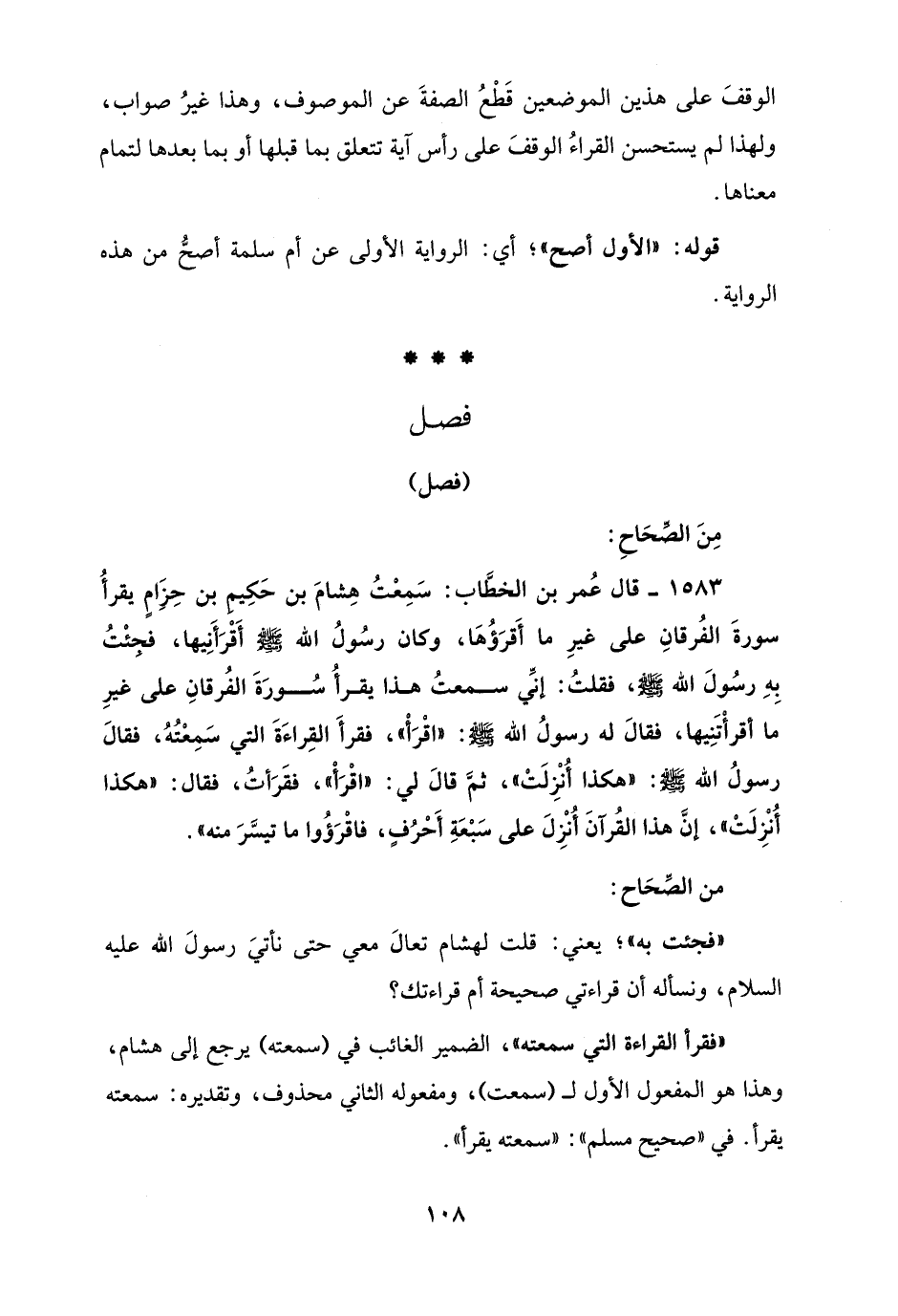 1583 - قال عُمر بن الخطَّاب: سَمِعْتُ هِشامَ بن حَكِيم بن حِزَامٍ يقرأُ سورةَ الفُرقانِ على غيرِ ما أَقرَؤُهَا، وكان رسُولُ الله - صلى الله عليه وسلم - قْرَأَنِيها، فجئْتُ بِهِ رسُولَ الله - صلى الله عليه وسلم -، فقلتُ: إنِّي سمعتُ هذا يقرأُ سُورَةَ الفُرقانِ على غيرِ ما أقرأْنِيها، فقالَ له رسولُ الله - صلى الله عليه وسلم -: "اقْرَأْ"، فقرأَ القِراءَةَ التي سَمِعْتُهُ، فقالَ رسولُ الله - صلى الله عليه وسلم -: "هكذا أُنْزِلَتْ"، ثمَّ قالَ لي: "اقْرَأْ"، فقَرَأتُ، فقال: "هكذا أُنْزِلَتْ"، إنَّ هذا القُرآنَ أُنْزِلَ على سَبْعَةِ أَحْرُفٍ، فاقْرَؤُوا ما تيسَّرَ منه".
