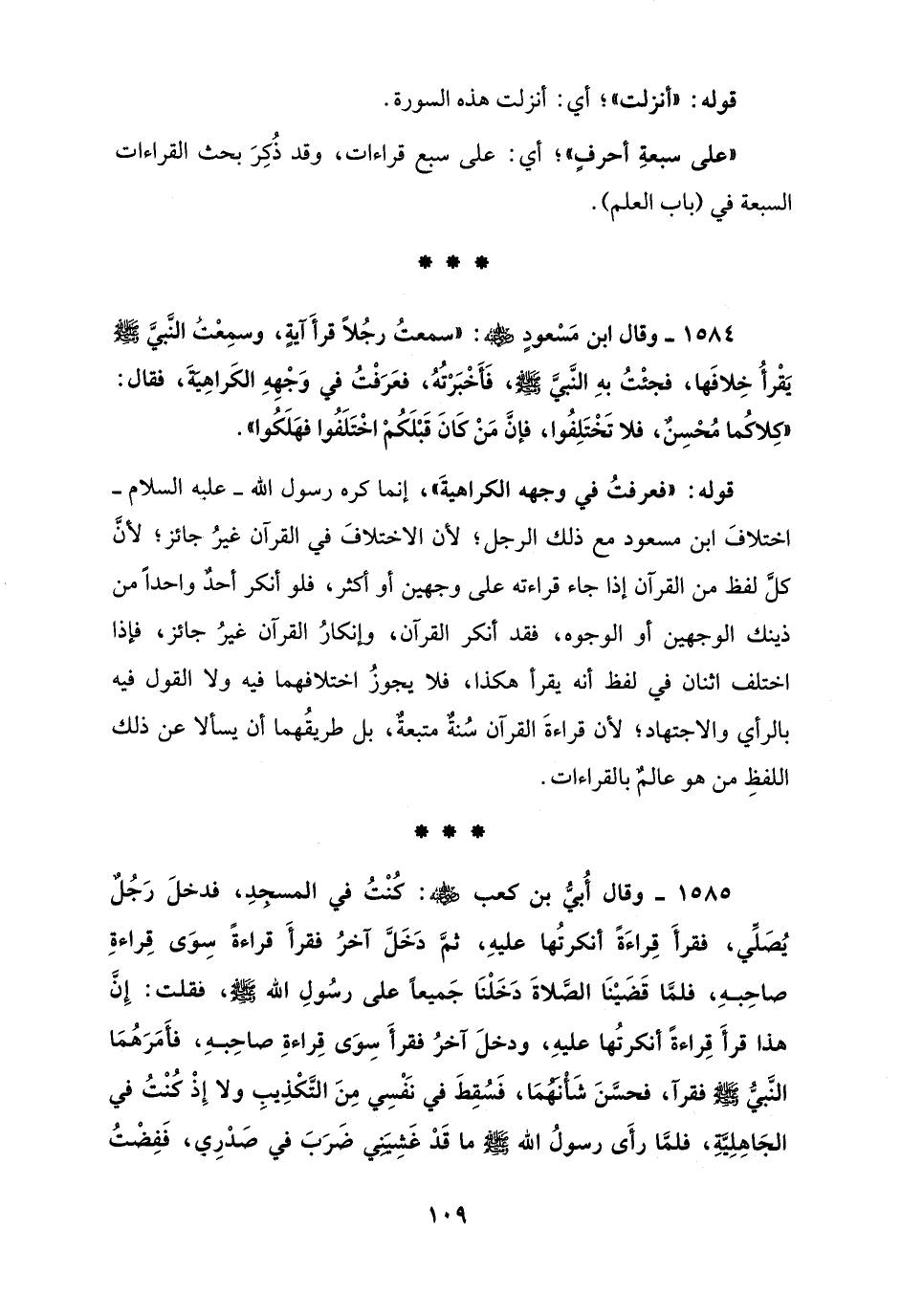 1584 - وقال ابن مَسْعودٍ - رضي الله عنه -: "سمعتُ رجُلاً قرأَ آيةٍ، وسمِعت النَّبيَّ - صلى الله عليه وسلم - يَقْرأُ خِلافَها، فجئْتُ بهِ النَّبيَّ - صلى الله عليه وسلم -، فَأخْبَرْتُهُ، فعَرَفْتُ في وَجْهِهِ الكَراهِيَةَ، فقال: "كِلاكُما مُحْسِن، فلا تَخْتَلِفُوا، فإن مَنْ كَانَ قَبْلَكُمْ اخْتَلَفُوا فهَلَكُوا".