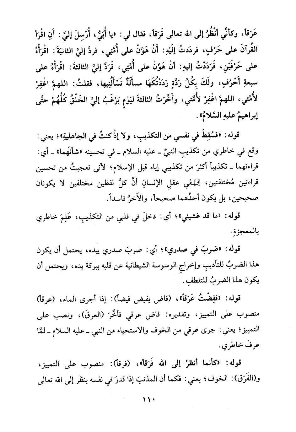 عَرَقًا، وكأنِّي أنْظُرُ إلى الله تعالى فَرَقًا، فقال لي: "يا أُبَيُّ، أُرْسِلَ إليَّ: أَنِ اقْرَأ القُرآنَ على حَرْفٍ، فردَدتُ إلَيْهِ: أَنْ هَوِّنْ على أُمَّتِي، فردَّ إليَّ الثانيَةَ: اقْرَأْهُ على حَرْفَيْنِ، فَرَدَدْتُ إليهِ: أنْ هَوِّنْ على أُمَّتِي، فَرَدَّ إليَّ الثالثةَ: اقْرَأْهُ على سبعةِ أَحْرُفٍ، ولَكَ بِكُلِّ رَدَّةٍ رَدَدْتُكَهَا مسأَلَةٌ تَسْأَلُنِيها، فقلتُ: اللَّهمَّ اغْفِرْ لأُمَّتي، اللَّهمَّ اغفِرْ لأُمَّتي، وأَخَّرْتُ الثالثةَ ليَوْمٍ يَرْغبُ إليَّ الخَلْقُ كُلُّهُمْ حتَّى إبراهيمُ عليهِ السَّلامُ".