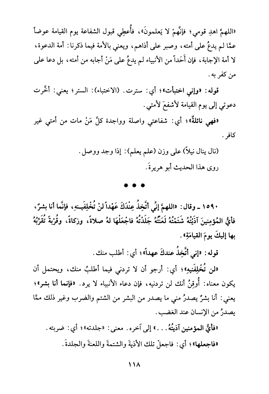 "اللهمَّ اهدِ قومي؛ فإنَّهمْ لا يَعلمونَ"، فأُعطِي قبول الشفاعة يوم القيامة عوضًا عمَّا لم يدع على أمته، وصبر على أذاهم، ويعني بالأمة فيما ذكرنا: أمة الدعوة، لا أمة الإجابة، فإن أَحَدًا من الأنبياء لم يدعُ على مَنْ أجابه من أمته، بل دعا على من كفر به.