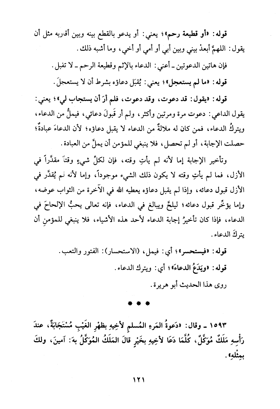 وتأخير الإجابة إما لأنه لم يأتِ وقته، فإن لكلِّ شيءٍ وقتًا مقدَّرًا في الأزل، فما لم يأتِ وقته لا يكون ذلك الشيء موجودًا، وإما لأنه لم يُقدَّر في الأزل قبول دعائه، وإذا لم يقبل دعاؤه يعطيه الله في الآخرة من الثواب عوضه، وإما يؤخَّر قبول دعائه؛ ليلحَّ ويبالغ في الدعاء، فإنه تعالى يحبُّ الإلحاحَ في الدعاء، فإذا كان تأخيرُ إجابة الدعاء لأحد هذه الأشياء، فلا ينبغي للمؤمنِ أن يتركَ الدعاء.