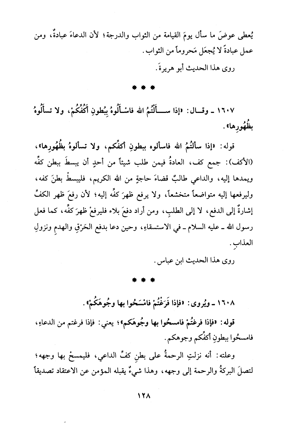 1607 - وقال: "إذا سأَلْتُمُ الله فاسْأَلُوهُ بِبُطونِ أَكُفِّكُمْ، ولا تسأَلُوهُ بظُهُورِها".