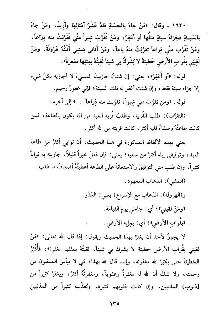 1620 - وقال: "مَنْ جاءَ بالحسَنةِ فلهُ عَشْرُ أمْثالِهَا وأَزِيدُ، ومَنْ جاءَ بالسَيئةِ فجَزاءُ سيئةٍ مثلُها أو أَغفِرُ، ومَنْ تَقَرَّبَ شِبرًا منِّي تَقَرَّبْتُ منه ذِرَاعًا، ومَنْ تَقَرَّب منِّي ذِراعًا تقرَّبْتُ منهُ باعًا، ومَنْ أَتاني يَمْشِي أَتَيْتُهُ هَرْوَلَةً، ومَنْ لَقِيَنِي بقُرابِ الأَرضِ خَطيئةً لا يُشْرِكُ بي شيئًا لَقِيتُهُ بمِثلِها مغفرةً".