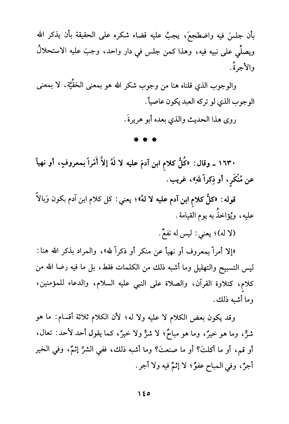 1630 - وقال: "كُلُّ كلامِ ابن آدمَ عليه لا لَهُ إلاَّ أَمْرًا بمعروفٍ، أو نهيًا عن مُنْكَرٍ، أو ذِكرًا للهِ"، غريب.