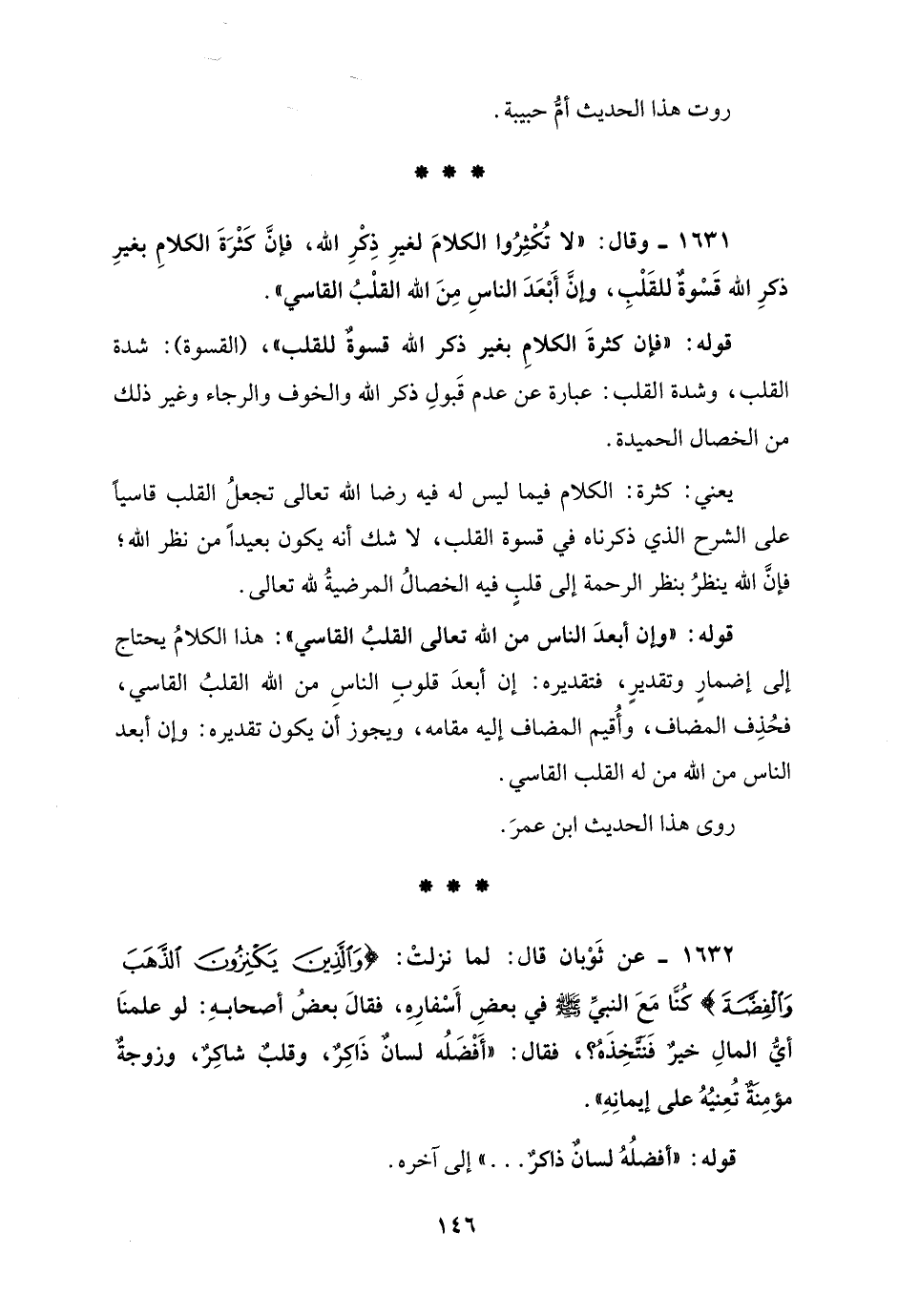 1631 - وقال: "لا تُكْثِرُوا الكلامَ لغيرِ ذِكْرِ الله، فإن كَثْرَةَ الكلامِ بغيرِ ذكرِ الله قَسْوةٌ للقَلْبِ، وإن أَبْعَدَ الناسِ مِنَ الله القلْبُ القاسي".