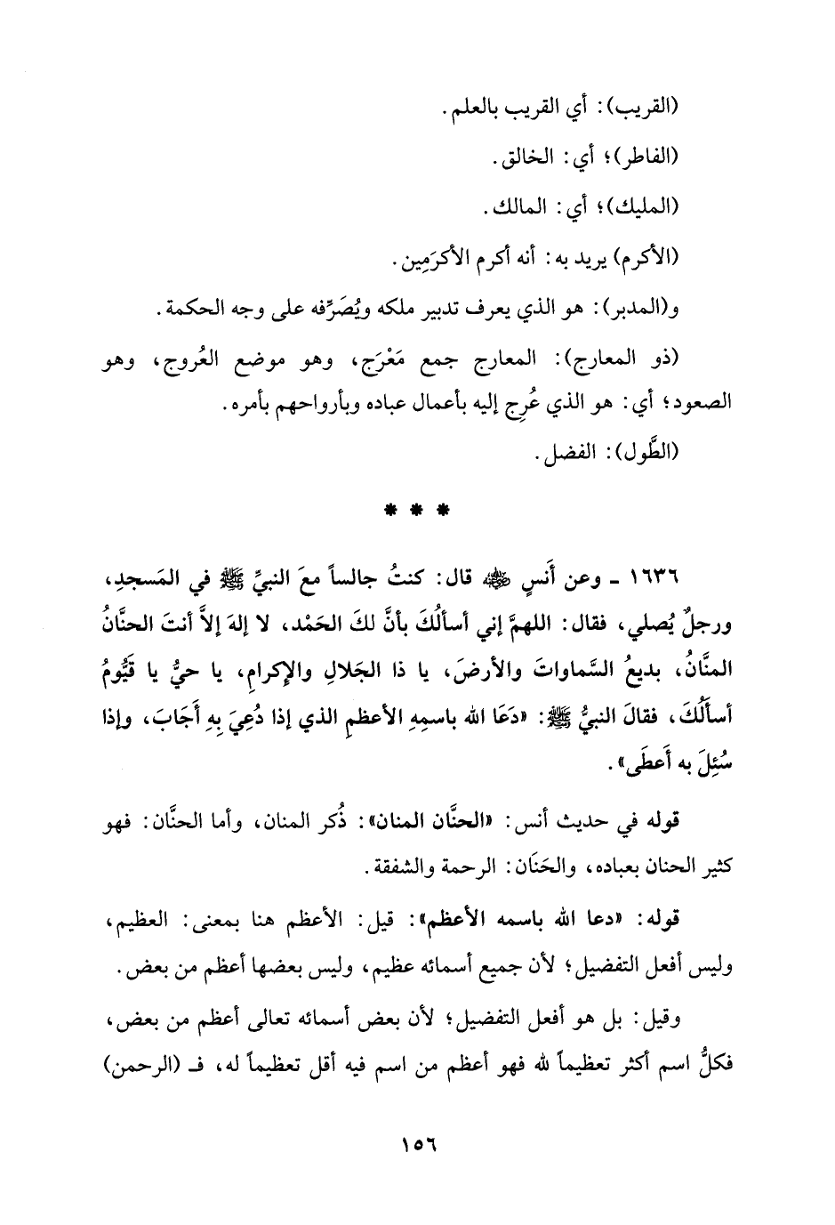 1636 - وعن أَنسٍ - رضي الله عنه - قال: كنتُ جالسًا معَ النبي - صلى الله عليه وسلم - في المَسجدِ، ورجلٌ يُصلي، فقال: اللهمَّ إني أسألُكَ بأنَّ لكَ الحَمْد، لا إلهَ إلاَّ أنتَ الحنَّانُ المنَّانُ، بديعُ السَّماواتَ والأرضَ، يا ذا الجَلالِ والإكرامِ، يا حيُّ يا قَيُّومُ أسأَلُكَ، فقالَ النبيُّ - صلى الله عليه وسلم -: "دَعَا الله باسمِهِ الأعظم الذي إذا دُعِيَ بِهِ أَجَابَ، وإذا سُئِلَ به أَعطَى".