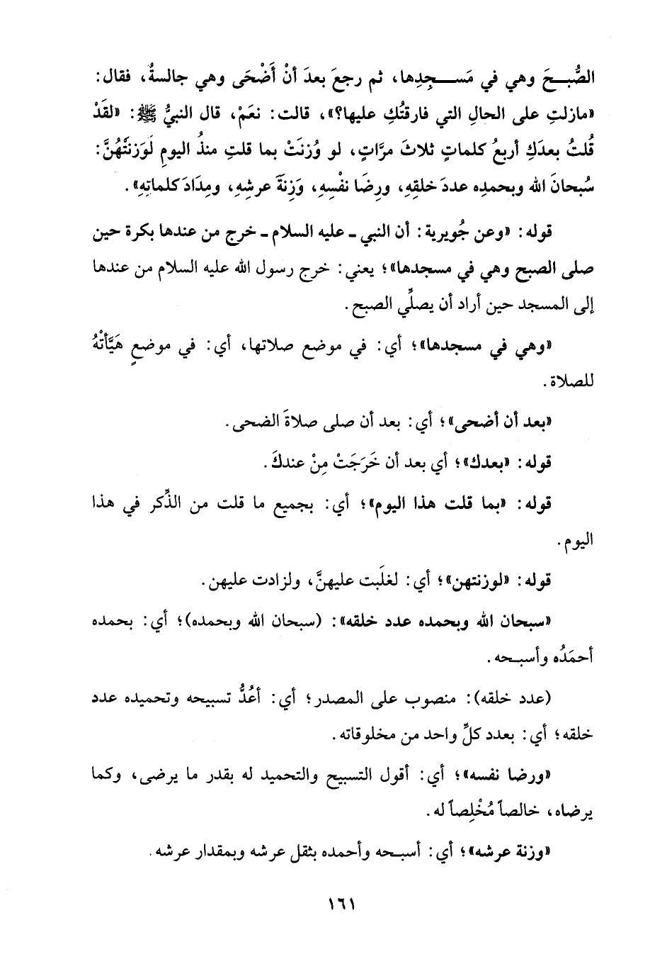 الصُّبحَ وهي في مَسجِدِها، ثم رجعَ بعدَ أنْ أَضْحَى وهي جالسةٌ، فقال: "مازلتِ على الحالِ التي فارقتُكِ عليها؟ "، قالت: نعَمْ، قال النبيُّ - صلى الله عليه وسلم -: "لقَدْ قُلتُ بعدَكِ أربعُ كلماتٍ ثلاثَ مرَّاتٍ، لو وُزنَتْ بما قلتِ منذُ اليومِ لَوَزنَتْهُنَّ: سُبحانَ الله وبحمدِهِ عددَ خلقِهِ، ورِضَا نفْسِهِ، وَزنَةَ عرشِهِ، ومِدَادَ كلماتِهِ".