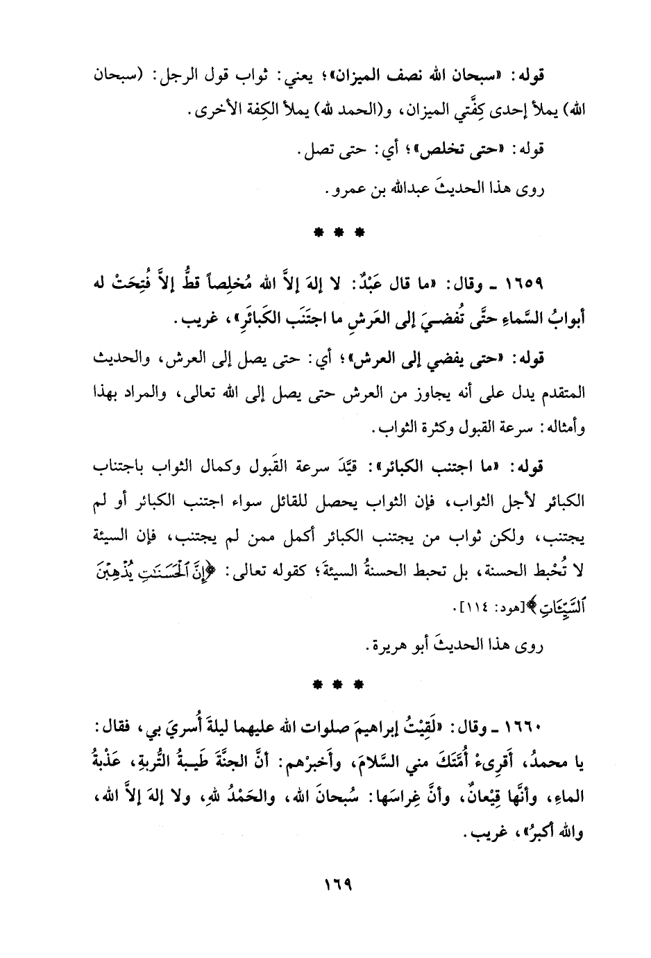 1660 - وقال: "لَقِيْتُ إبراهيمَ صلوات الله عليهما ليلةَ أُسريَ بي، فقال: يا محمدُ، أَقرِئْ أُمَّتَكَ مني السَّلامَ، وأَخبرْهم: أنَّ الجنَّةَ طَيبةُ التُّربةِ، عَذْبةُ الماءِ، وأنَّها قِيْعانٌ، وأنَّ غِراسَها: سُبحانَ الله، والحَمْدُ للهِ، ولا إلهَ إلاَّ الله، والله أكبرُ"، غريب.