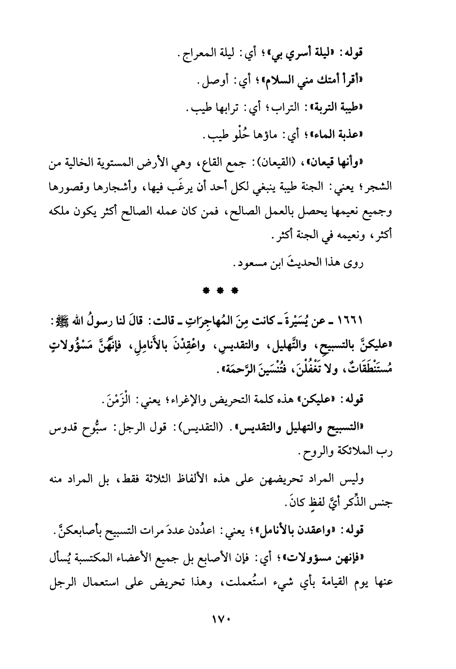 1661 - عن يُسَيْرةَ - كَانت مِنَ المُهاجِرَاتِ - قالت: قالَ لنا رسولُ الله - صلى الله عليه وسلم -: "عليكنَّ بالتسبيح، والتَّهليل، والتقديسِ، واعْقِدْنَ بالأَنامِلِ، فإنَّهُنَّ مَسْؤُولاتٍ مُستَنْطَقَاتٌ، ولا تَغْفُلْنَ، فتُنْسَينَ الرَّحمَة".