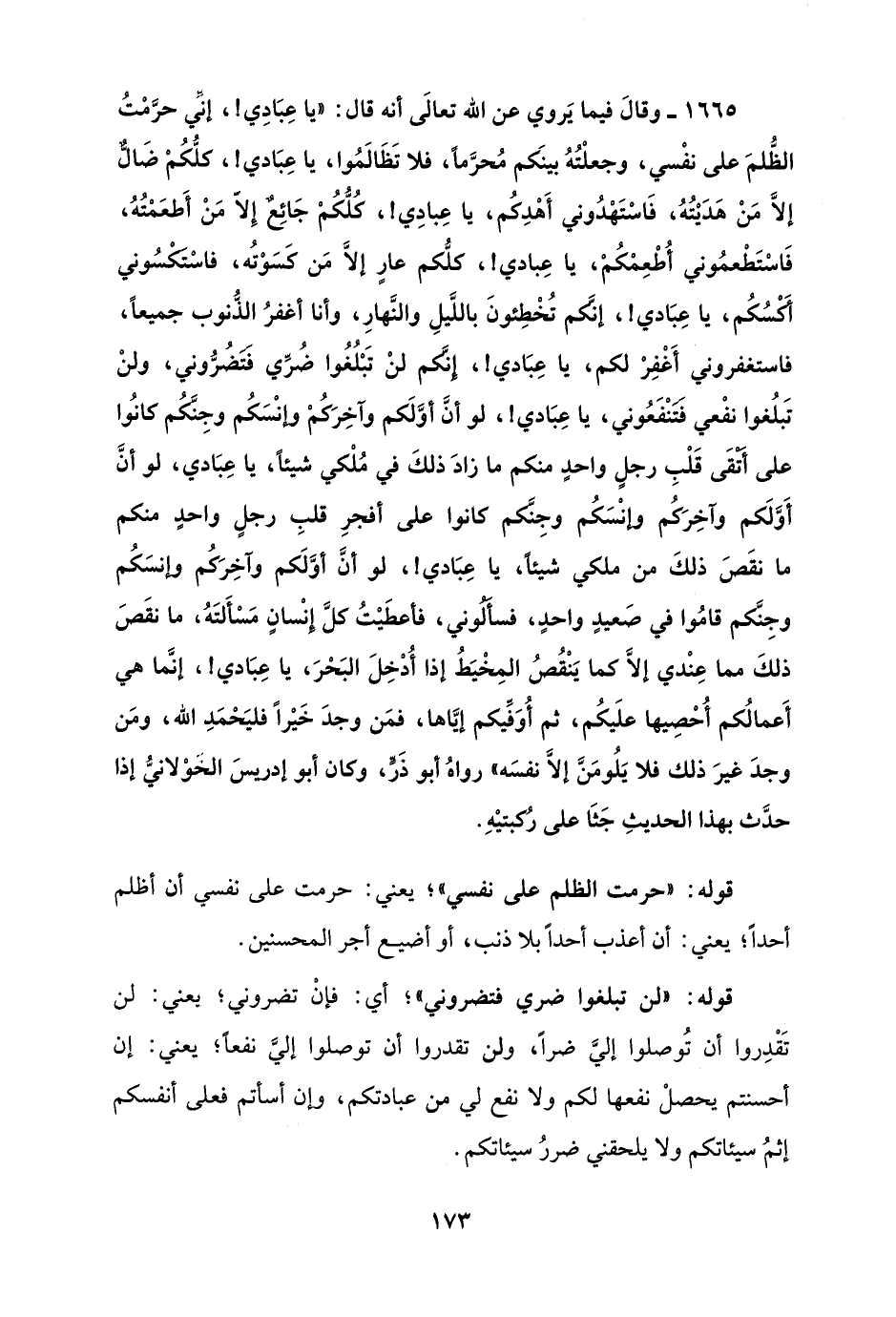 1665 - وقالَ فيما يَروي عن الله تعالَى أنه قال: "يا عِبَادِي!، إنَّي حرَّمْتُ الظُّلمَ على نفْسي، وجعلْتُهُ بينَكم مُحرَّمًا، فلا تَظَالَمُوا، يا عِبَادي!، كلُّكُمْ ضَالٌّ إلَّا مَنْ هدَيْتُهُ، فَاسْتَهْدُوني أَهْدِكُم، يا عِبادِي!، كُلُّكُم جَائِعٌ إِلّا مَنْ أَطعَمْتُهُ، فَاسْتَطْعمُوني أُطْعِمْكُم، يا عِبادي!، كلُّكم عارٍ إلَّا مَن كسَوْتُه، فاسْتَكْسُوني أَكْسُكُم، يا عِبَادي!، إنَّكم تُخْطِئونَ باللَّيلِ والنَّهارِ، وأنا أغفرُ الذُّنوب جميعًا، فاستغفروني أَغْفِرْ لكم، يا عِبَادي!، إِنَّكم لنْ تَبْلُغُوا ضُرِّي فَتَضُرُّوني، ولنْ تَبلُغوا نفْعي فَتَنْفَعُوني، يا عِبَادي!، لو أنَّ أوَّلَكم وآخِرَكُمْ وإنْسَكُم وجِنَّكُم كانُوا على أَتْقَى قَلْبِ رجلٍ واحدٍ منكم ما زادَ ذلكَ في مُلْكي شيئًا، يا عِبَادي، لو أنَّ أَوَّلَكم وآخِرَكُم وانْسَكُم وجِنَّكم كانوا على أفجرِ قلبِ رجلٍ واحدٍ منكم ما نقَصَ ذلكَ من ملكي شيئًا، يا عِبَادي!، لو أنَّ أوَّلَكم وآخِرَكُم وإنسَكُم وجِنَكم قامُوا في صَعيدٍ واحدٍ، فسأَلُوني، فأعطَيْتُ كلَّ إنْسانٍ مَسْأَلتَهُ، ما نقَصَ ذلكَ مما عِنْدي إلَّا كما يَنْقُصُ المِخْيَطُ إذا أُدخِلَ البَحرَ، يا عِبَادي!، إنَّما هي أَعمالُكم أُحْصِيها علَيكُم، ثم أُوَفِّيكم إيَّاها، فمَن وجدَ خَيْرًا فليَحْمَدِ الله، ومَن وجدَ غيرَ ذلك فلا يَلُومَنَّ إلَّا نفسَه" رواهُ أبو ذَرٍّ، وكان أبو إدريس الخوْلانيُّ إذا حدَّث بهذا الحديثِ جَثَا على رُكبتيْهِ.