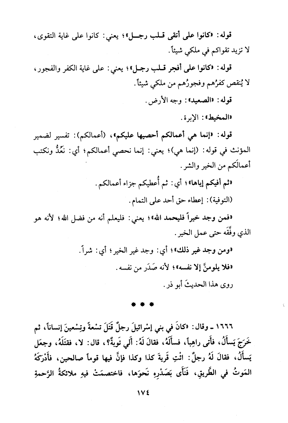 1666 - وقال: "كانَ في بني إسْرائيلَ رجلٌ قتَلَ تسْعةً وتِسْعينَ إنسانًا، ثم خَرَجَ يَسأَلُ، فاَتى راهِبًا، فسأَلَهُ، فقالَ لَهُ: أَلي تَوبةٌ؟، قال: لا، فقتَلَهُ، وجعَل يَسأَلُ، فقالَ لَهُ رجلٌ: ائْتِ قَريةَ كذا وكذا فإنَّ فيها قومًا صالحين، فأَدْرَكَهُ المَوتُ في الطَّريقِ، فَنَأَى بَصَدْرِهِ نَحوَها، فاختصمَتْ فيهِ ملائكةُ الرَّحمةِ
