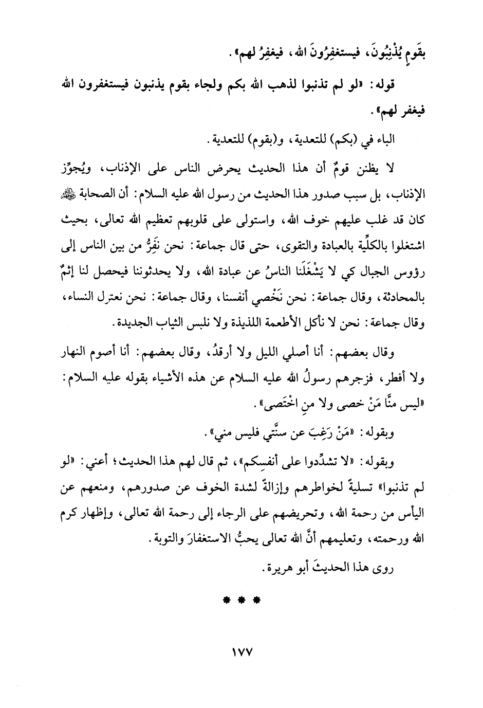 لا يظنن قومٌ أن هذا الحديث يحرض الناس على الإذناب، ويُجوِّز الإذناب، بل سبب صدور هذا الحديث من رسول الله عليه السلام: أن الصحابة - رضي الله عنهم - كان قد غلب عليهم خوف الله، واستولى على قلوبهم تعظيم الله تعالى، بحيث اشتغلوا بالكلَّية بالعبادة والتقوى، حتى قال جماعة: نحن نَفِرُّ من بين الناس إلى رؤوس الجبال كي لا يَشْغَلَنا الناسُ عن عبادة الله، ولا يحدثوننا فيحصل لنا إثمٌ بالمحادثة، وقال جماعة: نحن نَخْصي أنفسنا، وقال جماعة: نحن نعتزل النساء، وقال جماعة: نحن لا نأكل الأطعمة اللذيذة ولا نلبس الثياب الجديدة.