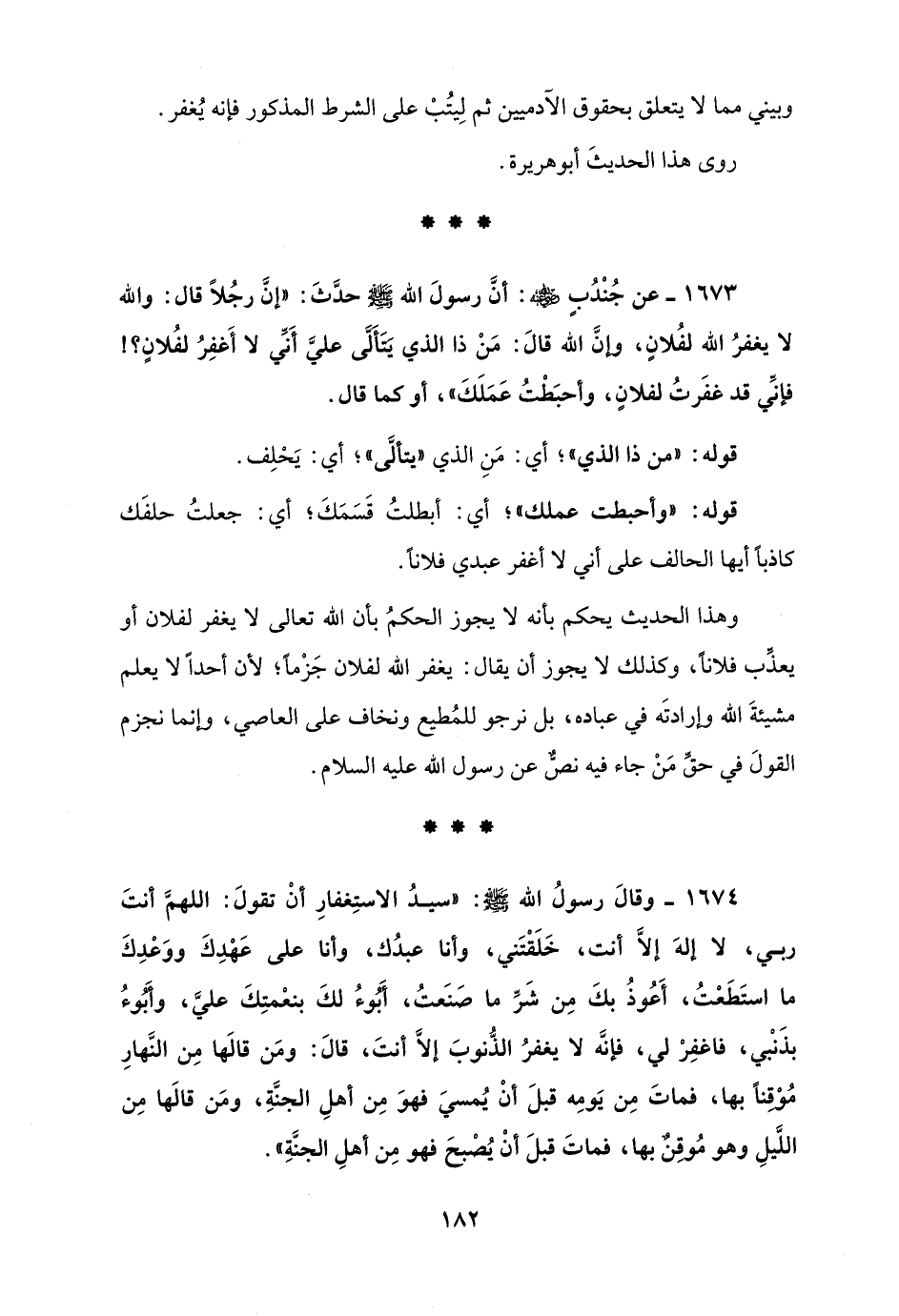 1673 - عن جُنْدُبٍ - رضي الله عنه -: أنَّ رسولَ الله - صلى الله عليه وسلم - حدَّثَ: "إنَّ رجُلاً قال: والله لا يغفرُ الله لفُلانٍ، وإنَّ الله قالَ: مَنْ ذا الذي يتَأَلَّى عليَّ أَنَّي لا أَغفِرُ لفُلانٍ؟! فإنَّي قد غفَرتُ لفلانٍ، وأحبَطْتُ عَمَلَكَ"، أو كما قال.