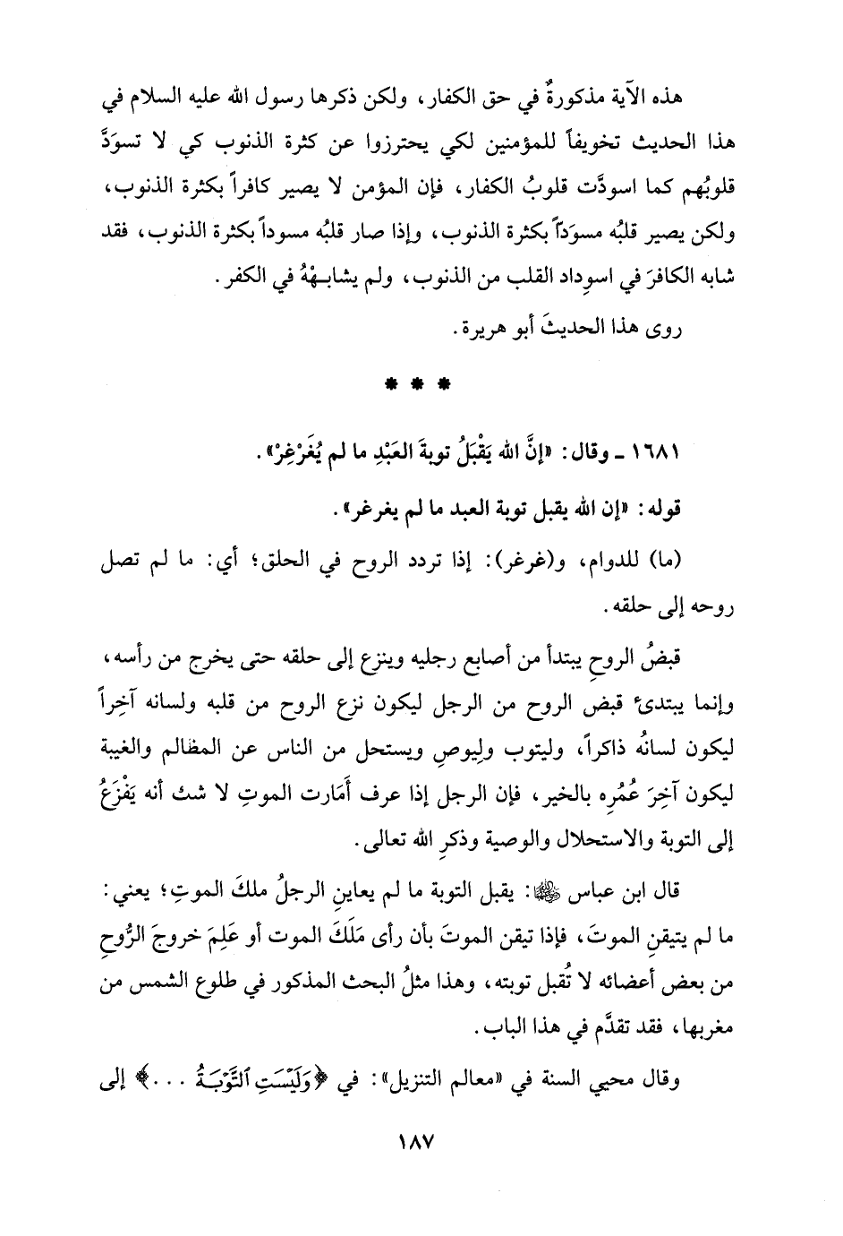 قال ابن عباس - رضي الله عنهما -: يقبل التوبة ما لم يعاينِ الرجلُ ملكَ الموتِ؛ يعني: ما لم يتيقنِ الموتَ، فإذا تيقن الموتَ بأن رأى مَلَكَ الموت أو عَلِمَ خروجَ الرُّوحِ من بعض أعضائه لا تُقبل توبته، وهذا مثلُ البحث المذكور في طلوع الشمس من مغربها، فقد تقدَّم في هذا الباب.