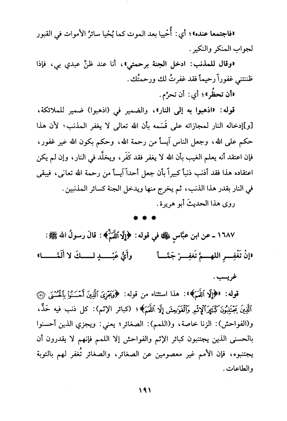 قوله: " {إِلَّا اللَّمَمَ} ": هذا استثناء من قوله: {وَيَجْزِيَ الَّذِينَ أَحْسَنُوا بِالْحُسْنَى (31) الَّذِينَ يَجْتَنِبُونَ كَبَائِرَ الْإِثْمِ وَالْفَوَاحِشَ إِلَّا اللَّمَمَ}؛ (كبائر الإثم): كل ذنب فيه حَدٌّ، و (الفواحش): الزنا خاصة، و (اللمم): الصغائر؛ يعني: ويجزي الذين أحسنوا بالحسنى الذين يجتنبون كبائر الإثم والفواحش إلا اللمم فإنهم لا يقدرون أن يجتنبوه، فإن الأمم غير معصومين عن الصغائر، والصغائر تُغفر لهم بالتوبة والطاعات.