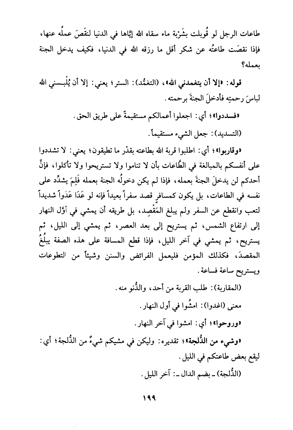 "وقاربوا"؛ أي: اطلبوا قربة الله بطاعته بقدْر ما تطيقون؛ يعني: لا تشددوا على أنفسكم بالمبالغة في الطَّاعات بأن لا تناموا ولا تستريحوا ولا تأكلوا، فإنَّ أحدكم لن يدخلَ الجنةَ بعمله، فإذا لم يكن دخولُه الجنة بعمله فَلِمَ يشدِّد على نفسه في الطاعات، بل يكون كمسافرٍ قصد سفرًا بعيدًا فإنه لو عَدَا عَدْوًا شديدًا لتعب وانقطع عن السفر ولم يبلغ المَقْصِد، بل طريقه أن يمشي في أوَّل النهار إلى ارتفاع الشمس، ثم يستريح إلى بعد العصر، ثم يمشي إلى الليل، ثم يستريح، ثم يمشي في آخر الليل، فإذا قطع المسافة على هذه الصفة يبلُغُ المقصدَ، فكذلك المؤمن فليعمل الفرائض والسنن وشيئًا من التطوعات ويستريح ساعة فساعة.