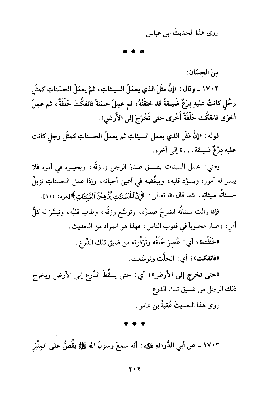 1702 - وقال: "إنَّ مثَلَ الذي يعمَلُ السيئاتِ، ثمَّ يعمَلُ الحسَناتِ كمثَلِ رجُلٍ كانتْ عليهِ دِرْعٌ ضَيقةٌ قد خنقَتْهُ، ثم عمِلَ حسَنةً فانفكَّتْ حَلْقَةٌ، ثم عمِلَ أخرَى فانفكَّت حَلْقَةٌ أُخْرَى حتى تَخْرُجَ إلى الأَرضِ".