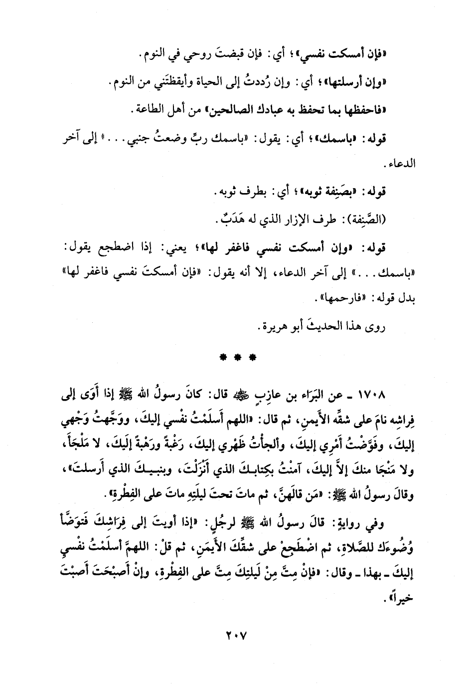 1708 - عن البَرَاء بن عازِبٍ - رضي الله عنه - قال: كانَ رسولُ الله - صلى الله عليه وسلم - إذا أَوَى إلى فِراشِه نامَ على شقَّه الأَيمنِ، ثم قال: "اللهم أَسلَمْتُ نفْسي إليكَ، ووَجَّهتُ وَجْهي إليكَ، وفَوَّضْتُ أَمْرِي إليكَ، وألجأْتُ ظَهْري إليكَ، رَغْبةً ورَهْبةً إلَيكَ، لا مَلْجَأَ، ولا مَنْجَا منكَ إلَّا إليكَ، آمنْتُ بكِتابكَ الذي أَنْزَلْتَ، وبنبيكَ الذي أَرسلتَ"، وقالَ رسولُ الله - صلى الله عليه وسلم -: "مَن قالَهنَّ، ثم ماتَ تحتَ ليلَتِهِ ماتَ على الفِطْرةِ".