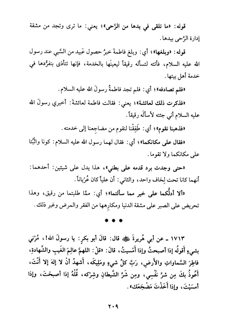1713 - عن أبي هُريرةَ - رضي الله عنه - قال: قالَ أبو بكرٍ: يا رسولَ الله!، مُرْني بشيءٍ أَقولُه إذا أصبحتُ وإذا أَمْسيتُ، قالَ: "قلْ: اللهمَّ عالِمَ الغَيبِ والشَّهادةِ، فاطِرَ السَّماواتِ والأَرضِ، رَبَّ كلِّ شيءٍ ومَلِيكَه، أَشهدُ أنْ لا إلهَ إلا أَنْتَ، أَعُوذُ بكَ مِن شرِّ نَفْسِي، ومِن شَرِّ الشَّيطانِ وشِرْكه، قُلْهُ إذا أصبحتَ، وإذا أمسَيْتَ، وإذا أَخَذْتَ مَضْجَعَك".