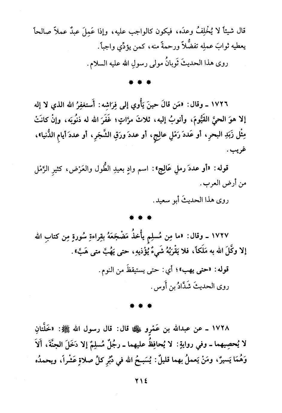 1726 - وقال: "مَن قالَ حينَ يَأْوي إلى فِرَاشِه: أَستغفِرُ الله الذي لا إله إلا هوَ الحيَّ القَيُّومَ، وأتوبُ إليه، ثلاثَ مرَّاتٍ؛ غَفَرَ الله له ذنُوبَه، وإنْ كانَتْ مِثْل زَبَدِ البحرِ، أو عَددَ رَمْلِ عالِجٍ، أو عددَ ورَقِ الشَّجَرِ، أو عددَ أيامِ الدُّنيا"، غريب.