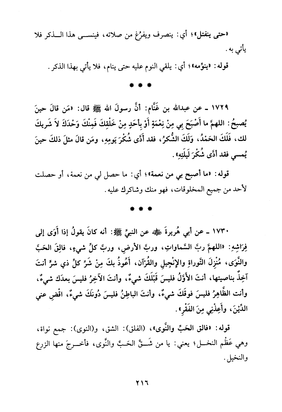 1729 - عن عبد الله بن غَنَّام: أنَّ رسولَ الله - صلى الله عليه وسلم - قال: "مَن قالَ حينَ يُصبحُ: اللهمَّ ما أَصْبَحَ بِي مِنْ نِعْمَةٍ أَوْ بِأحَدٍ مِنْ خَلْقِكَ فَمِنْكَ وحْدَكَ لاَ شَريكَ لك، فَلَكَ الحَمْدُ، وَلَكَ الشُّكرُ، فقد أَدَّى شُكْرَ يَومِهِ، ومَن قالَ مثلَ ذلكَ حينَ يُمسي فقد أدَّى شُكْرَ لَيلَتِهِ".