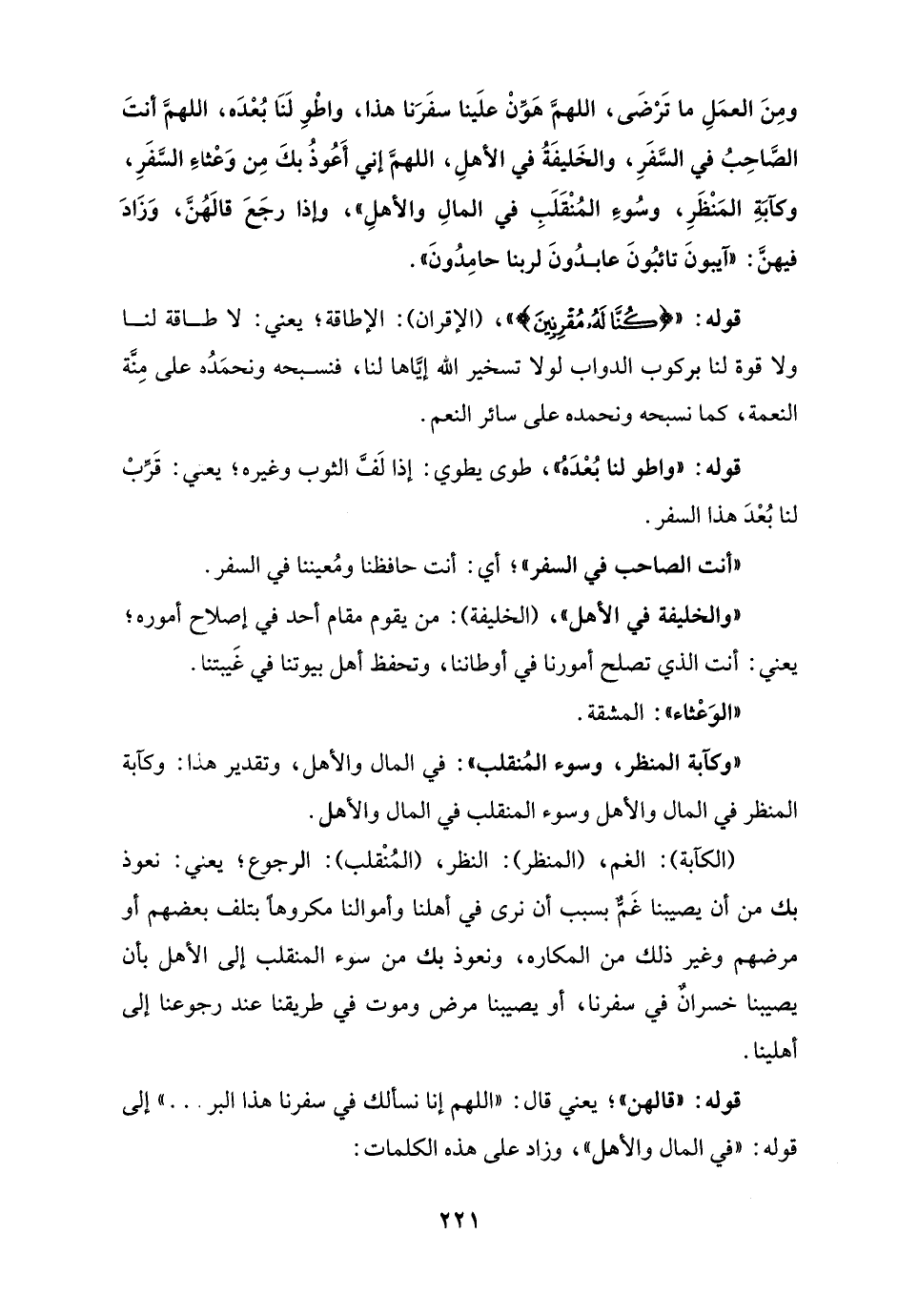 ومِنَ العمَلِ ما تَرْضَى، اللهمَّ هَوِّنْ علَينا سفَرَنا هذا، واطْوِ لَنَا بعدَه، اللهمَّ أنتَ الصَّاحِبُ في السَّفَرِ، والخَليفَةُ في الأهلِ، اللهمَّ إني أَعُوذُ بكَ مِن وَعْثاءِ السَّفَرِ، وكآبَةِ المَنْظَرِ، وسُوءِ المُنْقَلَبِ في المالِ والأهلِ"، وإذا رجَعَ قالَهُنَّ، وَزَادَ فيهنَّ: "آيبونَ تائبُونَ عابدُونَ لربنا حامِدُونَ".