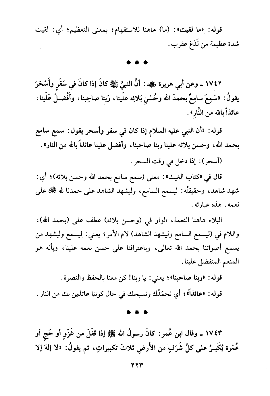 1742 - وعن أبي هريرة - رضي الله عنه -: أنَّ النبيَّ - صلى الله عليه وسلم - كانَ إذا كانَ في سَفَرٍ وأَسْحَرَ يقولُ: "سَمعَ سامِعٌ بحمدَ الله وحُسْنِ بَلائِه علَينا، رَبنا صاحِبنا، وأَفْضلْ عَلَينا، عائذًا بالله من النَّارِ".