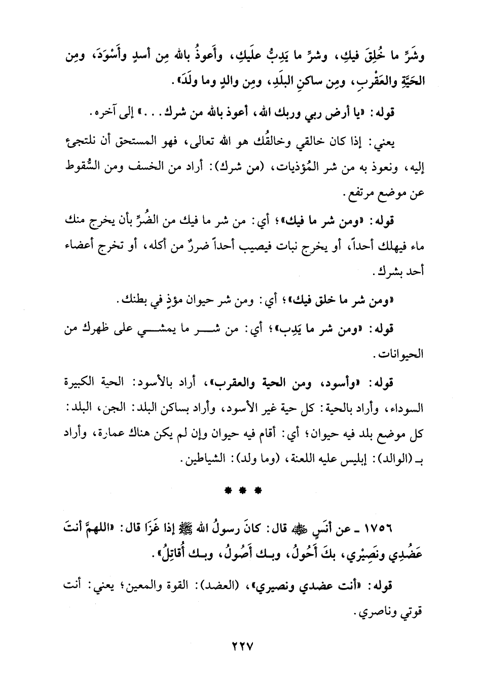 1756 - عن أنَسٍ - رضي الله عنه - قال: كانَ رسولُ الله - صلى الله عليه وسلم - إذا غَزا قال: "اللهمَّ أنتَ عَضُدِي ونصَيْري، بكَ أَحُولُ، وبك أَصُولُ، وبك أُقاتِلُ".
