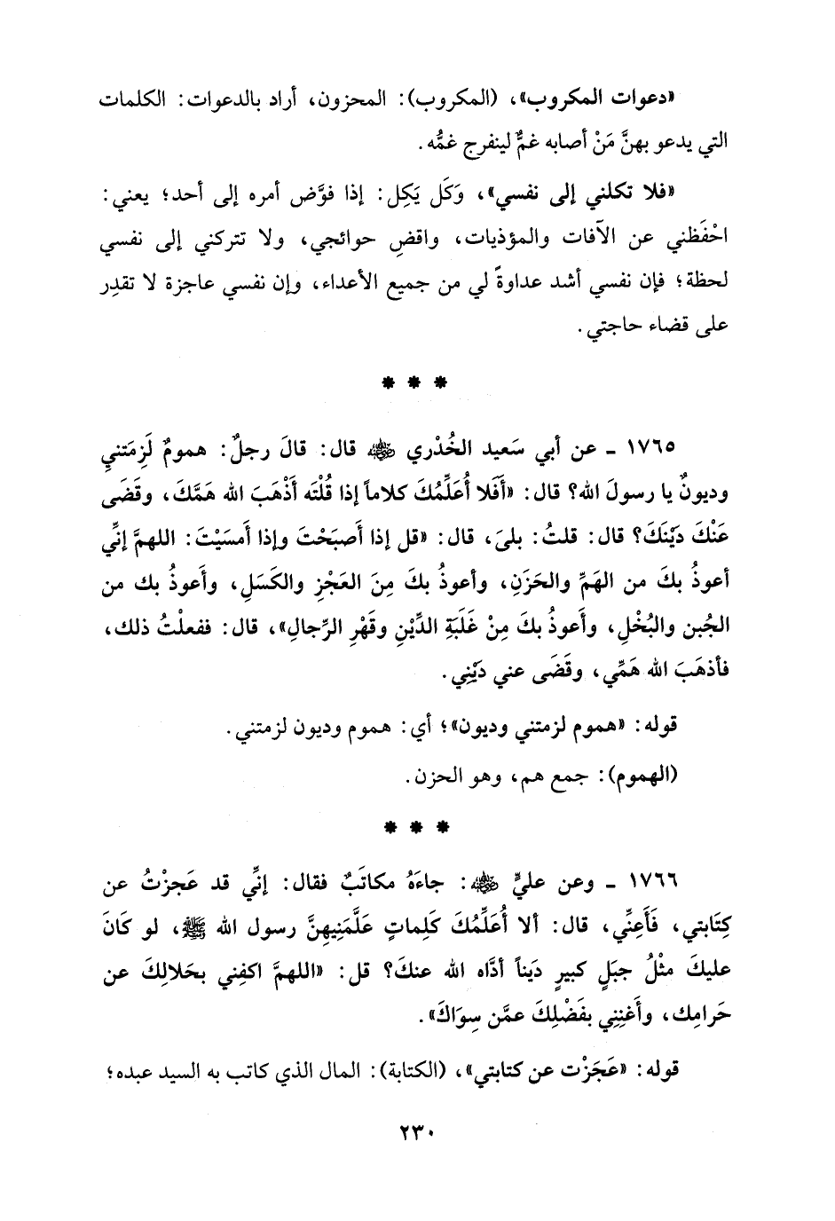1766 - وعن عليًّ - رضي الله عنه -: جاءَهُ مكاتَبٌ فقال: إنَّي قد عَجزْتُ عن كِتَابتي، فَأَعِنِّي، قال: ألا أُعَلَّمُكَ كلِماتٍ عَلَّمَنِيهِنَّ رسول الله - صلى الله عليه وسلم -، لو كَانَ عليكَ مثْلُ جبَلٍ كبيرٍ دَينًا أدَّاه الله عنكَ؟ قل: "اللهمَّ اكفِني بحَلالِكَ عن حَرامِك، وأَغنِنِي بفَضْلِكَ عمَّن سِواكَ".