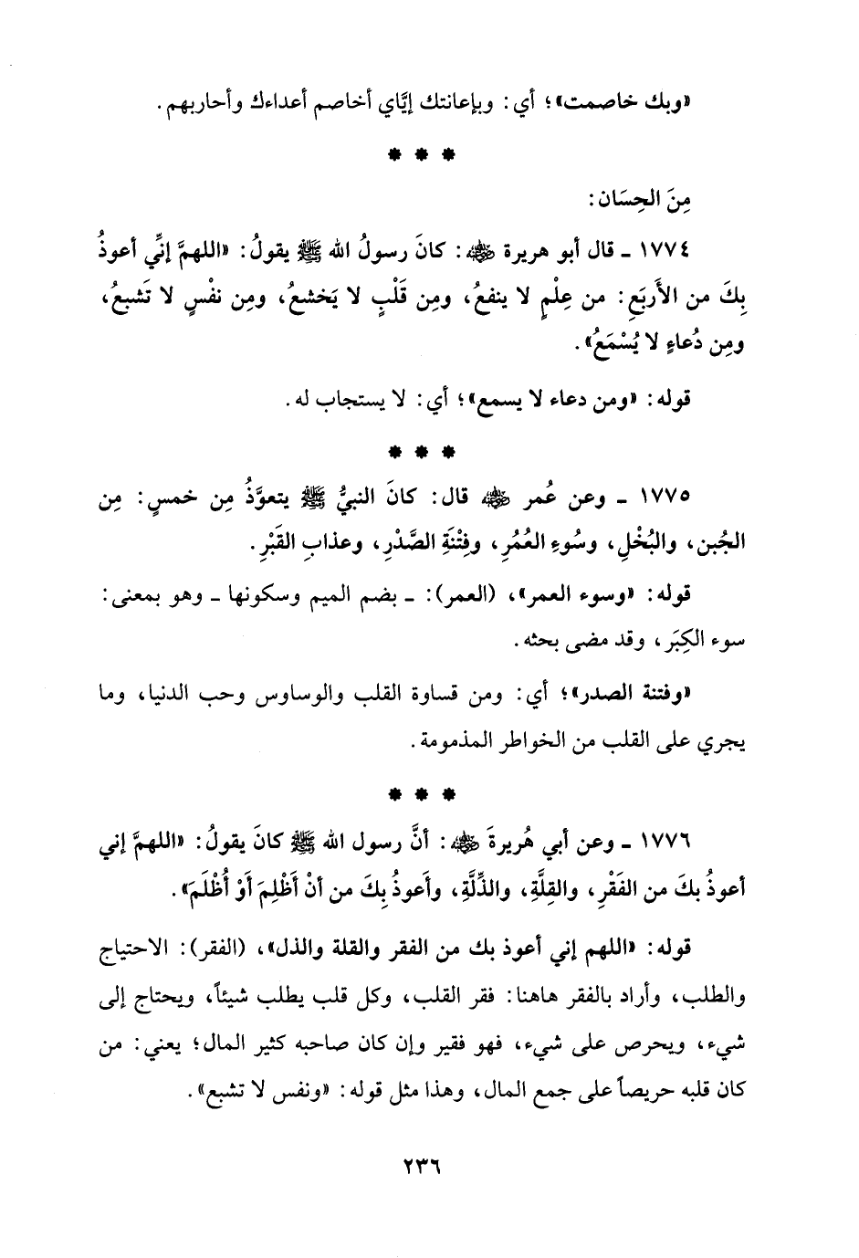 1776 - وعن أبي هُريرةَ - رضي الله عنه -: أنَّ رسول الله - صلى الله عليه وسلم - كانَ يقولُ: "اللهمَّ إني أعوذُ بكَ من الفَقْرِ، والقِلَّةِ، والذِّلَّةِ، وأَعوذُ بِكَ من أنْ أَظْلِمَ أَوْ أُظْلَمَ".