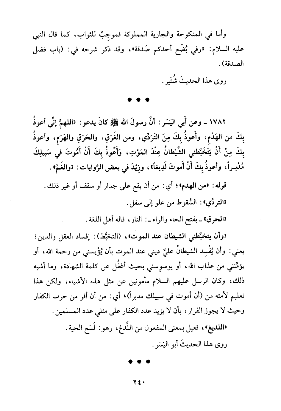 1782 - وعن أَبي اليَسَر: أنَّ رسولَ الله - صلى الله عليه وسلم - كانَ يدعو: "اللهمَّ إنِّي أعوذُ بِكَ من الهدْمِ، وأَعوذُ بِكَ مِنَ التَرَدِّي، ومن الغَرَقِ، والحَرَقِ والهَرَمِ، وأعوذُ بِكَ مِنْ أَنْ يتَخَبَّطني الشَّيْطانُ عِنْدَ المَوْتِ، وَأَعُوذُ بِكَ أَنْ أَمُوتَ في سَبيلِكَ مُدبرًا، وأعوذُ بِكَ أَنْ أَموتَ لَدِيغًا"، وزِيْدَ في بعض الرِّوايات: "والغَمِّ".