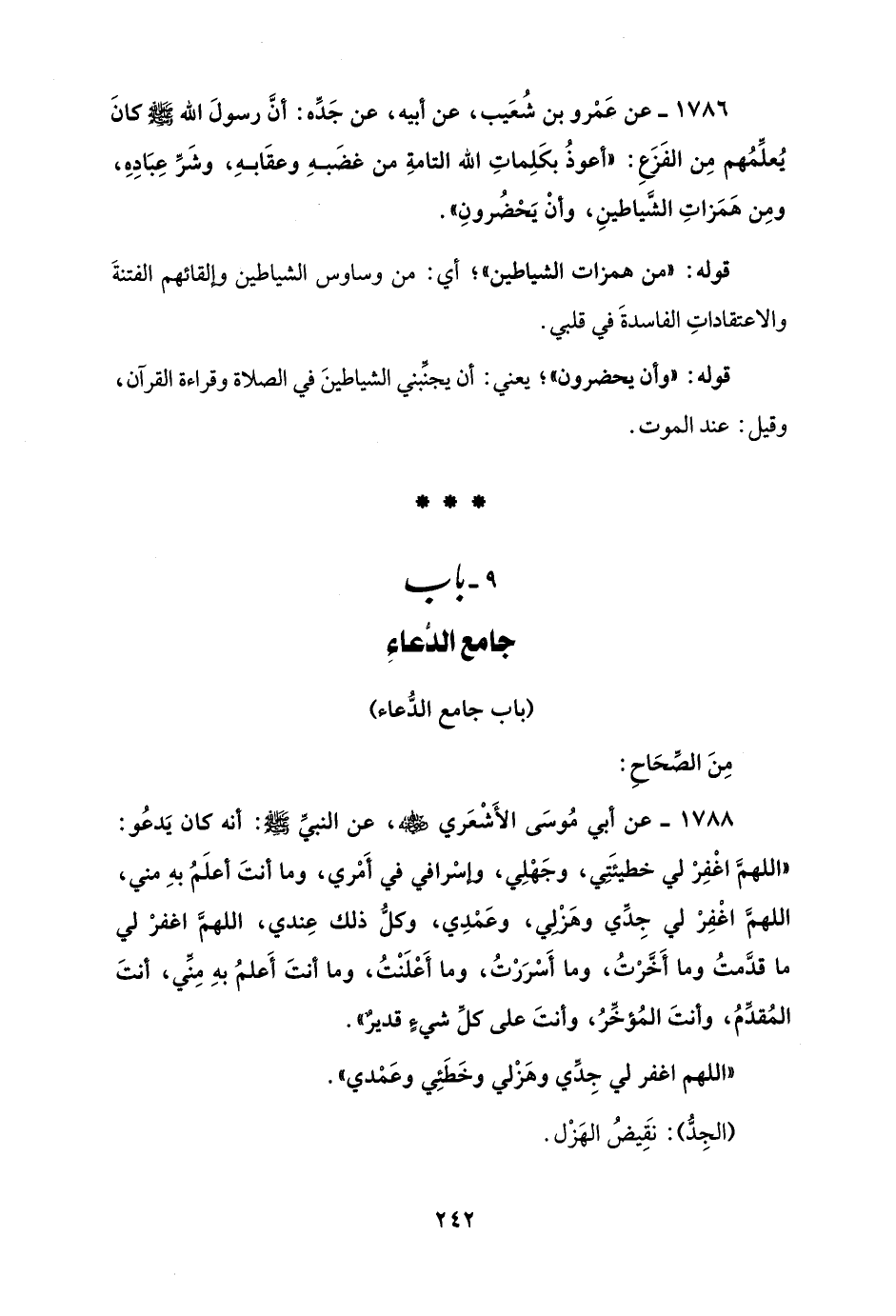 1788 - عن أبي مُوسَى الأَشْعَري - رضي الله عنه -، عن النبيَّ - صلى الله عليه وسلم -: أنه كان يَدعُو: "اللهمَّ اغْفِرْ لي خطيئَتِي، وجَهْلِي، وإسْرافي في أَمْري، وما أنتَ أعلَمُ بهِ مني، اللهمَّ اغْفِرْ لي جِدِّي وهَزْلي، وعَمْدِي، وكلُّ ذلك عِندي، اللهمَّ اغفرْ لي ما قدَّمتُ وما أَخَّرْتُ، وما أَسْرَرْتُ، وما أَعْلَنْتُ، وما أنتَ أَعلمُ بهِ مِنِّي، أنتَ المُقدِّمُ، وأنتَ المُؤخِّرُ، وأنتَ على كلِّ شيءٍ قديرٌ".