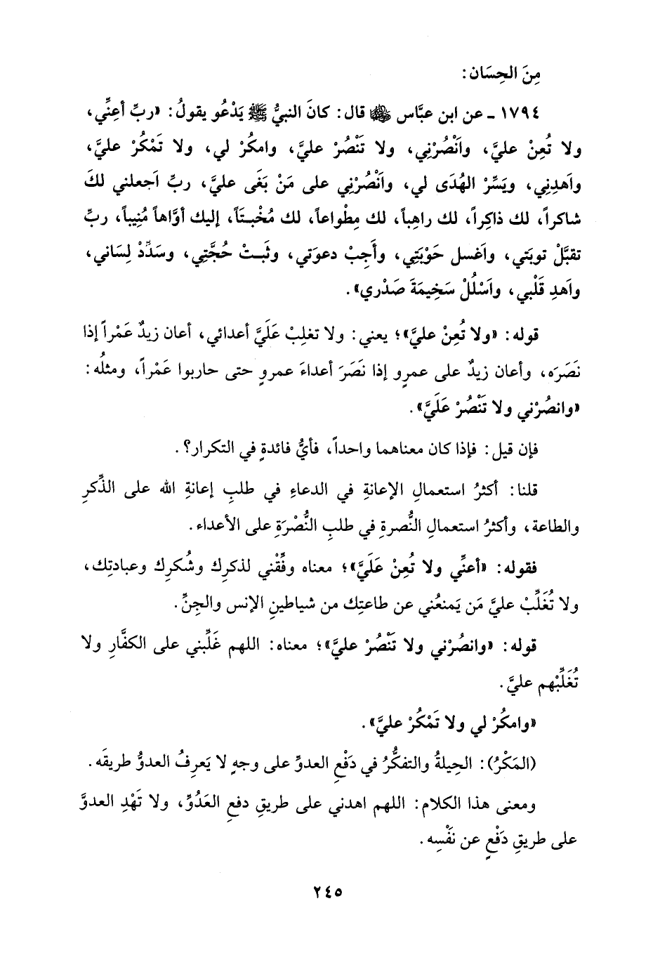 1794 - عن ابن عبَّاس - رضي الله عنهما - قال: كانَ النبيُّ - صلى الله عليه وسلم - يَدْعُو يقولُ: "ربِّ أعِنِّي، ولا تُعِنْ عليَّ، واَنْصُرْنِي، ولا تَنْصُرْ عليَّ، وامكُرْ لي، ولا تَمْكُرْ عليَّ، واَهدِنِي، ويَسِّرْ الهُدَى لي، واَنْصُرْنِي على مَنْ بَغَى عليَّ، ربِّ اَجعلني لكَ شاكرًا، لك ذاكِرًا، لك راهِبًا، لك مِطْواعًا، لك مُخْبتَاً، إليك أوَّاهًا مُنِيبًا، ربِّ تقبَّلْ توبَتي، واَغسل حَوْبَتِي، وأَجِبْ دعوَتي، وثَبتْ حُجَّتِي، وسَدِّدْ لِساني، واَهدِ قَلْبي، واَسْلُلْ سَخِيمَةَ صَدْري".