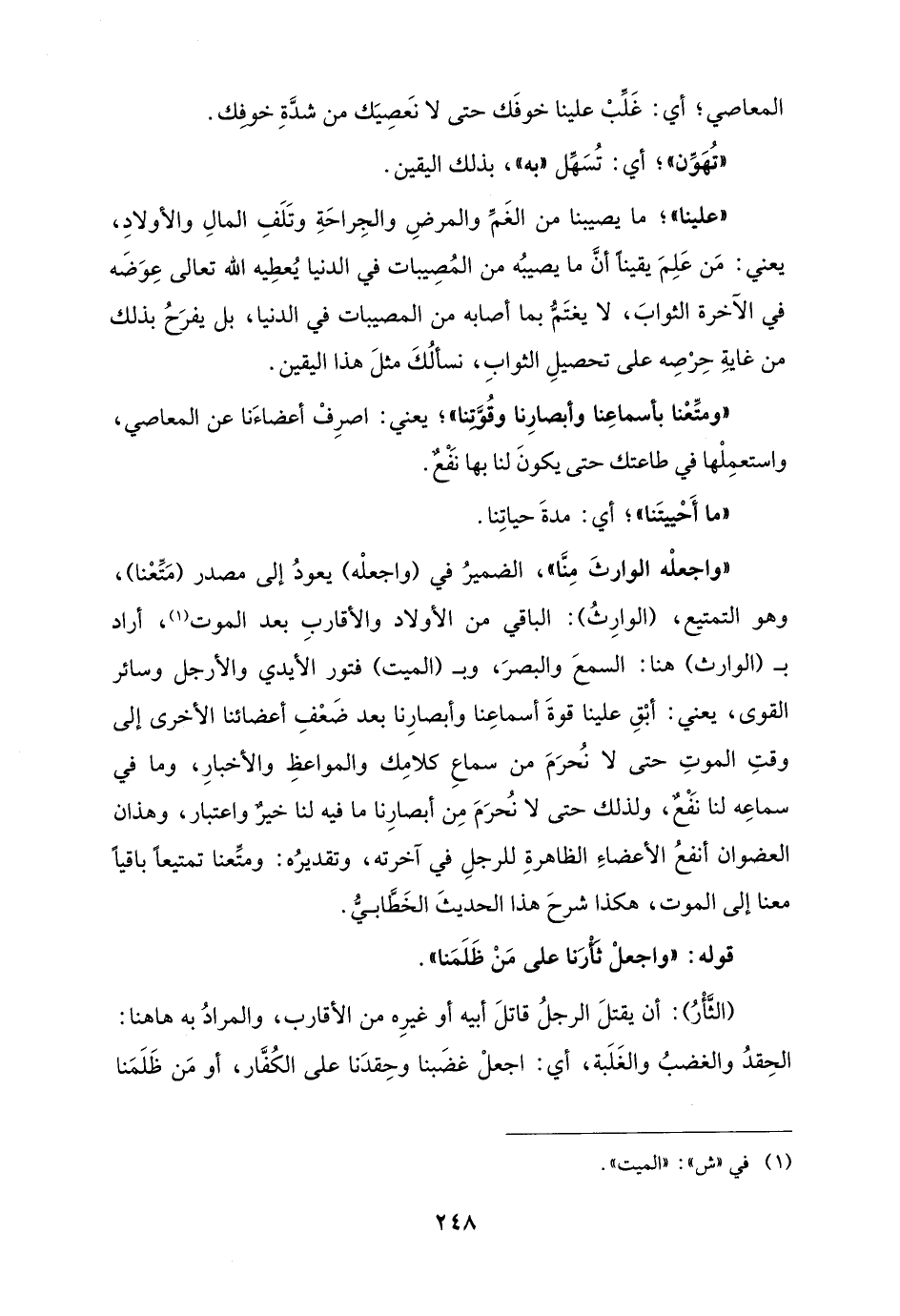 "واجعلْه الوارثَ مِنَّا"، الضميرُ في (واجعلْه) يعودُ إلى مصدر (مَتِّعْنا)، وهو التمتيع، (الوارِثُ): الباقي من الأولاد والأقاربِ بعد الموت (¬1)، أراد بـ (الوارث) هنا: السمعَ والبصرَ، وبـ (الميت) فتور الأيدي والأرجل وسائر القوى، يعني: أبْقِ علينا قوةَ أسماعِنا وأبصارِنا بعد ضَعْفِ أعضائنا الأخرى إلى وقتِ الموتِ حتى لا نُحرَمَ من سماعِ كلامِك والمواعظِ والأخبارِ، وما في سماعِه لنا نَفْعٌ، ولذلك حتى لا نُحرَمَ مِن أبصارِنا ما فيه لنا خيرٌ واعتبار، وهذان العضوان أنفعُ الأعضاءِ الظاهرةِ للرجلِ في آخرته، وتقديرُه: ومتِّعنا تمتيعًا باقيًا معنا إلى الموت، هكذا شرحَ هذا الحديثَ الخَطَّابيُّ.
