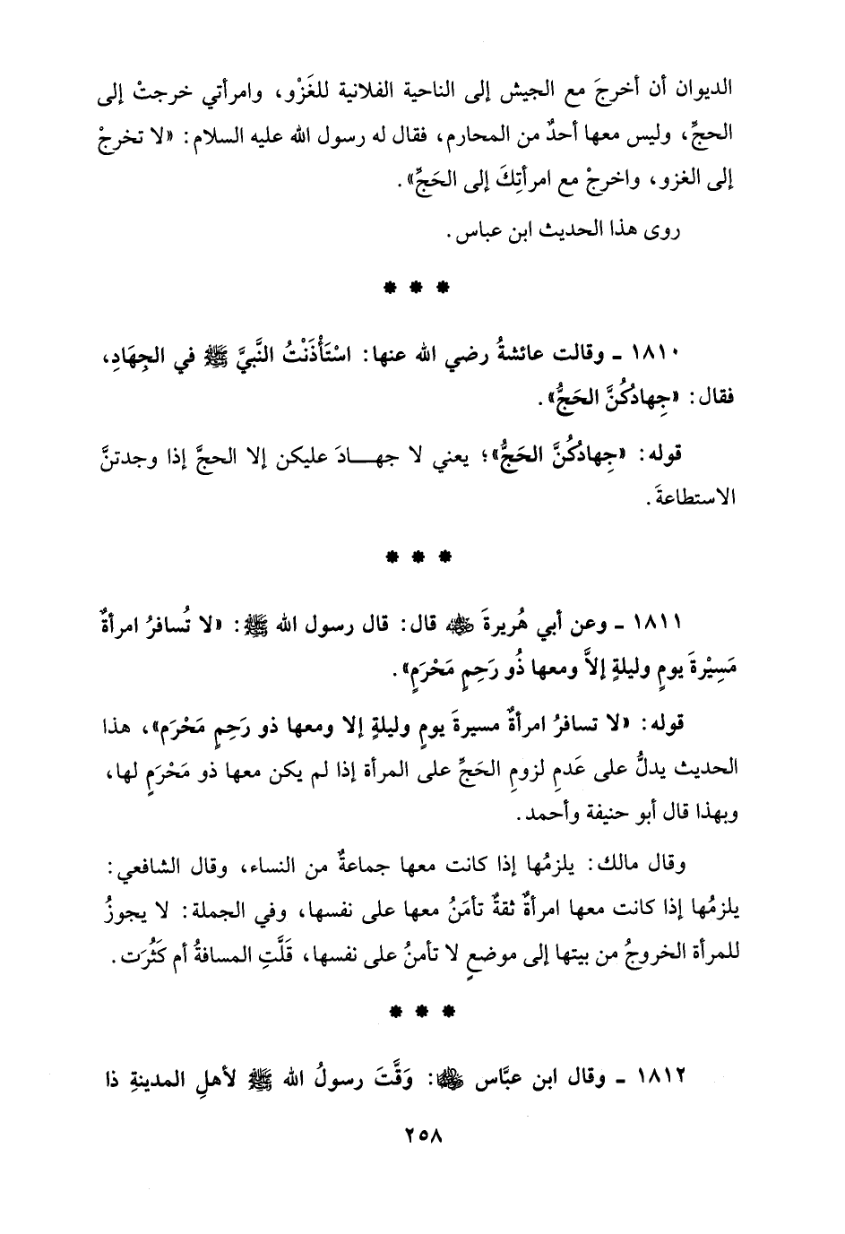 1811 - وعن أبي هُريرةَ - رضي الله عنه - قال: قال رسول الله - صلى الله عليه وسلم -: "لا تُسافرُ امرأةٌ مَسِيْرةَ يومٍ وليلةٍ إلَّا ومعها ذُو رَحمٍ مَحْرَمٍ".