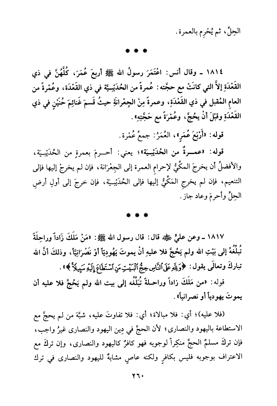 1814 - وقال أنس: اعْتَمَرَ رسولُ الله - صلى الله عليه وسلم - أربعَ عُمَرَ، كُلَّهُنَّ في ذي القَعْدَةِ إلَّا التي كانَتْ مع حجَّته: عُمرةً من الحُدَيْبيَّة في ذي القَعْدَة، وعُمْرةً من العام المُقبل في ذي القَعْدَةِ، وعمرةً مِنْ الجِعْرانَةِ حيثُ قَسمَ غَنائِمَ حُنَيْنٍ في ذي القَعْدَةِ وقبلَ أنْ يحُجَّ، وعُمْرَةً مع حَجَّتِهِ".