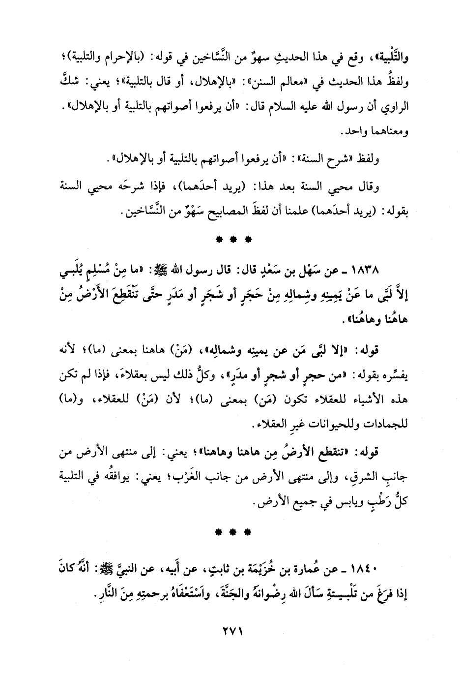 1838 - عن سَهْل بن سَعْدٍ قال: قال رسول الله - صلى الله عليه وسلم -: "ما مِنْ مُسْلِمٍ يُلَبي إلَّا لَبَّى ما عَنْ يَمِينِهِ وشِمالِهِ مِنْ حَجَرٍ أو شَجَرٍ أو مَدَرٍ حتَّى تَنْقَطِعَ الأرْضُ مِنْ ها هُنا وها هُنا".