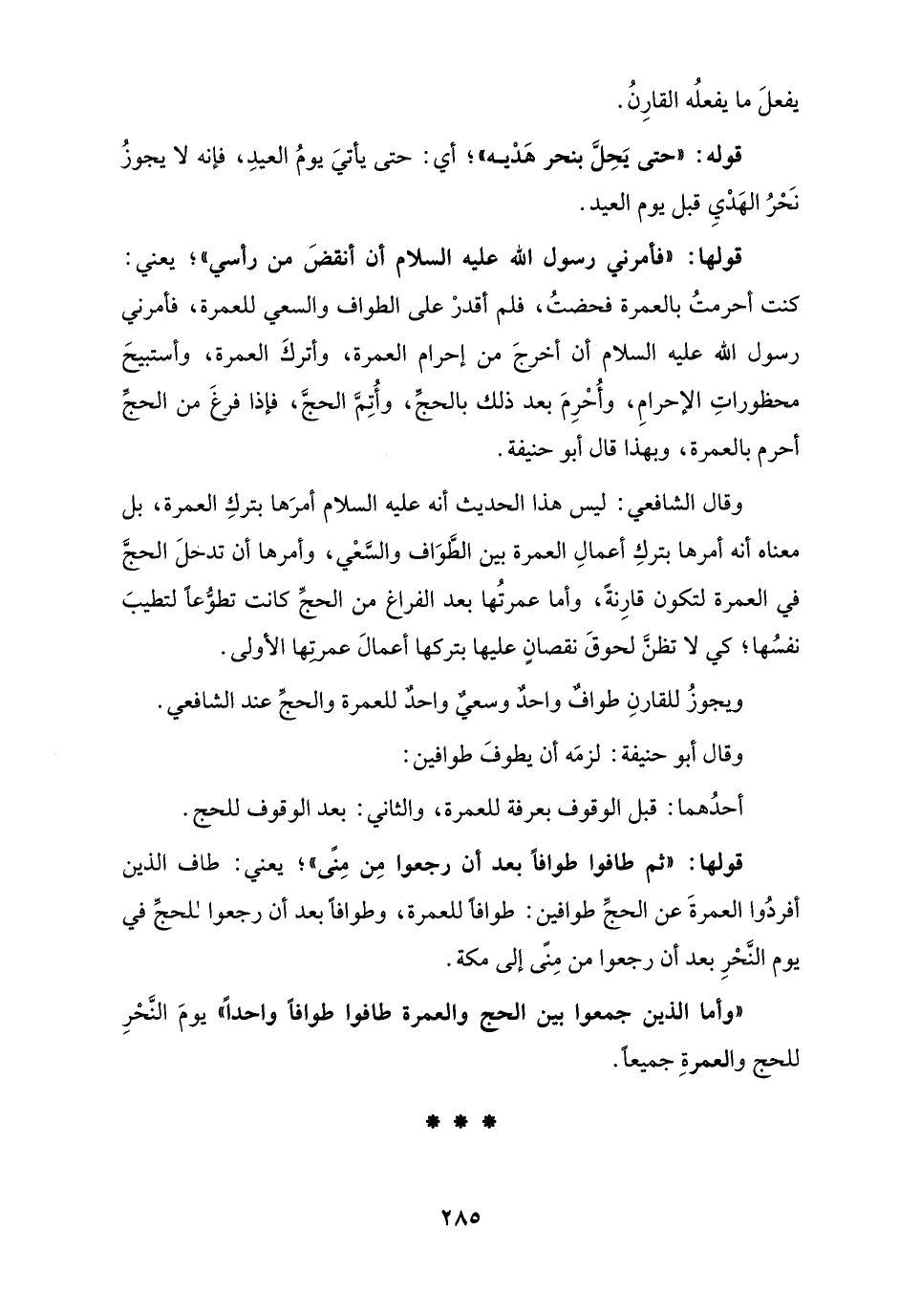 وقال الشافعي: ليس هذا الحديث أنه عليه السلام أمرَها بتركِ العمرة، بل معناه أنه أمرها بتركِ أعمالِ العمرة بين الطَّوَاف والسَّعْي، وأمرها أن تدخلَ الحجَّ في العمرة لتكون قارِنةً، وأما عمرتُها بعد الفراغ من الحجِّ كانت تطوُّعًا لتطيبَ نفسُها؛ كي لا تظنَّ لحوقَ نقصانٍ عليها بتركها أعمالَ عمرتِها الأولى.