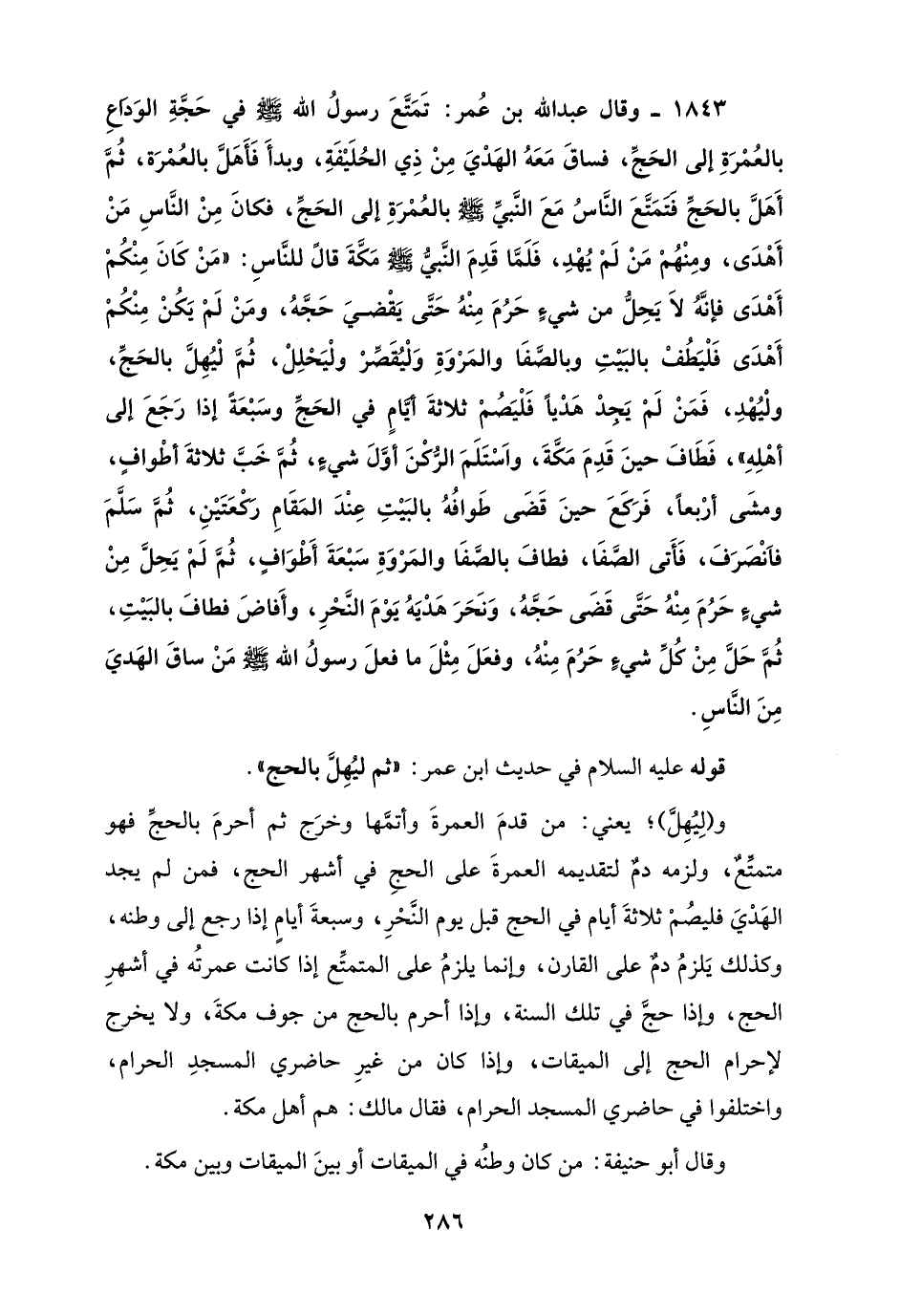 1843 - وقال عبد الله بن عُمر: تَمَتَّعَ رسولُ الله - صلى الله عليه وسلم - في حَجَّةِ الوَدَاعِ بالعُمْرَةِ إلى الحَجِّ، فساقَ مَعَهُ الهَدْيَ مِنْ ذِي الحُلَيْفَةِ، وبدأَ فَأَهَلَّ بالعُمْرَة، ثمَّ أَهَلَّ بالحَجِّ فتَمَتَّعَ النَّاسُ مَعَ النَّبيِّ - صلى الله عليه وسلم - بالعُمْرَةِ إلى الحَجِّ، فكانَ مِنْ النَّاسِ مَنْ أَهْدَى، ومِنْهُمْ مَنْ لَمْ يُهْدِ، فَلَمَّا قَدِمَ النَّبيُّ - صلى الله عليه وسلم - مَكَّةَ قالَ للنَّاسِ: "مَنْ كَانَ مِنْكُمْ أَهْدَى فإنَّهُ لاَ يَحِلُّ من شيءٍ حَرُمَ مِنْهُ حَتَّى يَقْضيَ حَجَّهُ، ومَنْ لَمْ يَكُنْ مِنْكُمْ أَهْدَى فَلْيَطُفْ بالبَيْتِ وبالصَّفَا والمَرْوَةِ وَلْيُقَصِّرْ ولْيَحْلِلْ، ثُمَّ لْيُهِلَّ بالحَجِّ، ولْيُهْدِ، فَمَنْ لَمْ يَجدْ هَدْيًا فَلْيَصُمْ ثلاثةَ أيَّامٍ في الحَجِّ وسَبْعَةً إذا رَجَعَ إلى أهْلِهِ"، فَطَافَ حينَ قَدِمَ مَكَّةَ، واَسْتَلَمَ الرُّكْنَ أوَّلَ شيءٍ، ثُمَّ خَبَّ ثلاثةَ أطْوافٍ، ومشَى أرْبعًا، فَرَكَعَ حينَ قَضَى طَوافُهُ بالبَيْتِ عِنْدَ المَقَامِ رَكْعَتَيْنِ، ثُمَّ سَلَّمَ فاَنْصَرَفَ، فَأَتى الصَّفَا، فطافَ بالصَّفَا والمَرْوَةِ سَبْعَةَ أَطْوَافٍ، ثُمَّ لَمْ يَحِلَّ مِنْ شيءٍ حَرُمَ مِنْهُ حَتَّى قَضَى حَجَّهُ، وَنَحَرَ هَدْيَهُ يَوْمَ النَّحْرِ، وأَفاضَ فطافَ بالبَيْتِ، ثُمَّ حَلَّ مِنْ كُلِّ شيءٍ حَرُمَ مِنْهُ، وفعَلَ مِثْلَ ما فعلَ رسولُ الله - صلى الله عليه وسلم - مَنْ ساقَ الهَديَ مِنَ النَّاسِ.