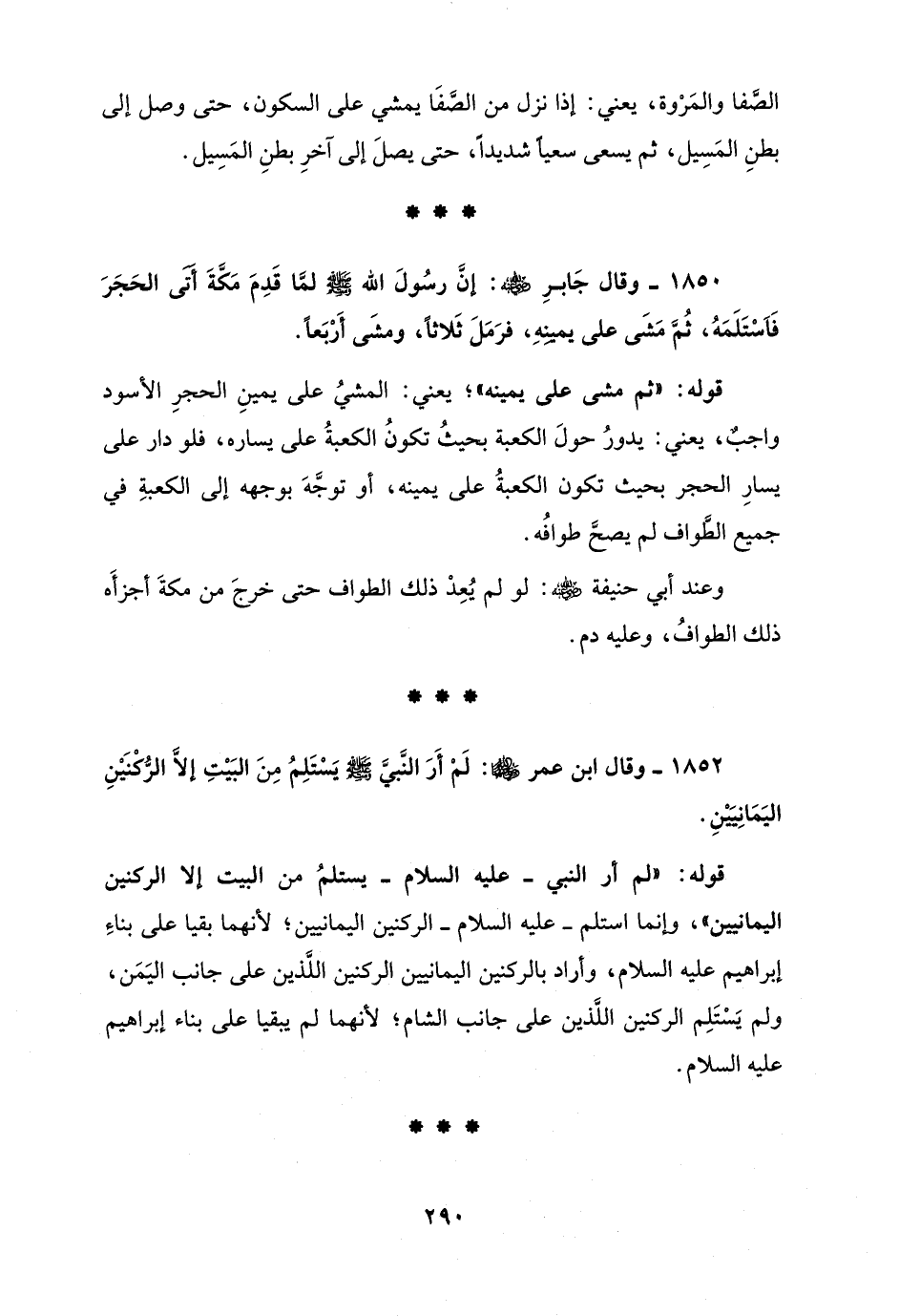 1850 - وقال جَابرِ - رضي الله عنه -: إنَّ رسُولَ الله - صلى الله عليه وسلم - لمَّا قَدِمَ مَكَّةَ أَتَى الحَجَرَ فَاَسْتَلَمَهُ، ثُمَّ مَشَى على يمينِهِ، فرَمَلَ ثَلاثًا، ومشَى أَرْبَعًا.