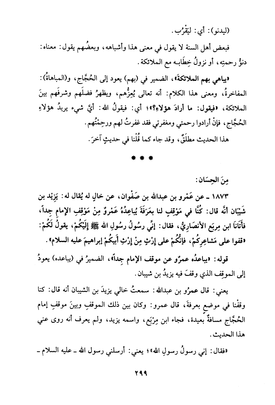 1873 - عن عَمْرو بن عبد الله بن صفْوان، عن خالٍ له يُقال له: يَزِيْد بن شَيْبَان أنَّه قال: كُنَّا في مَوْقِفٍ لنا بعَرَفَةَ يُباعِدُهُ عَمْروٌ مِنْ مَوْقِفِ الإِمامِ جِدًا، فأَتَانَا ابن مِربَع الأنصَارِيُّ، فقال: إنِّي رسُولُ رسُولِ الله - صلى الله عليه وسلم - إِلَيْكُمْ، يقولُ لَكُمْ: "قفوا على مَشاعِرِكُمْ، فإنَّكُمْ على إِرْثٍ مِنْ إِرْثِ أَبيكُمْ إبراهيمَ عليه السلام".