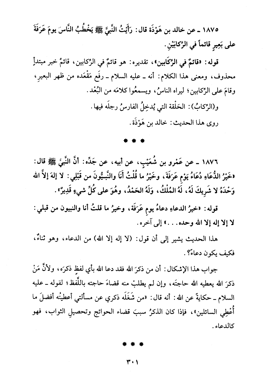 1875 - عن خالد بن هَوْذَة قال: رَأَيْتُ النَّبيَّ - صلى الله عليه وسلم - يَخْطُبُ النَّاسَ يومَ عَرَفَةَ على بَعِيرٍ قائمًا في الرِّكابَيْنِ.