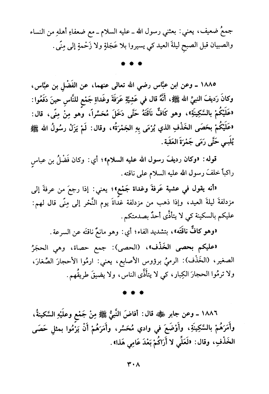 1885 - وعن ابن عبَّاس رضي الله تعالى عنهما، عن الفَضْلِ بن عبَّاس، وكانَ رَديفَ نبيِّ الله - صلى الله عليه وسلم -، أَنَّهُ قال في عَشِيَّةِ عَرَفَةَ وغَداةِ جَمْعٍ للنَّاسِ حينَ دَفَعُوا: "عَلَيْكُمْ بالسَّكِينَةِ"، وهو كَافٌّ نَاقَتَهُ حَتَّى دَخَلَ مُحَسِّرًا، وهو مِنْ مِنًى، قال: "عَلَيْكُمْ بحَصَى الخَذْفِ الذي يُرْمَى بِهِ الجَمْرَةُ"، وقال: لَمْ يَزَلْ رسُولُ الله - صلى الله عليه وسلم - يُلَبي حَتَّى رَمَى جَمْرَةَ العَقَبة.