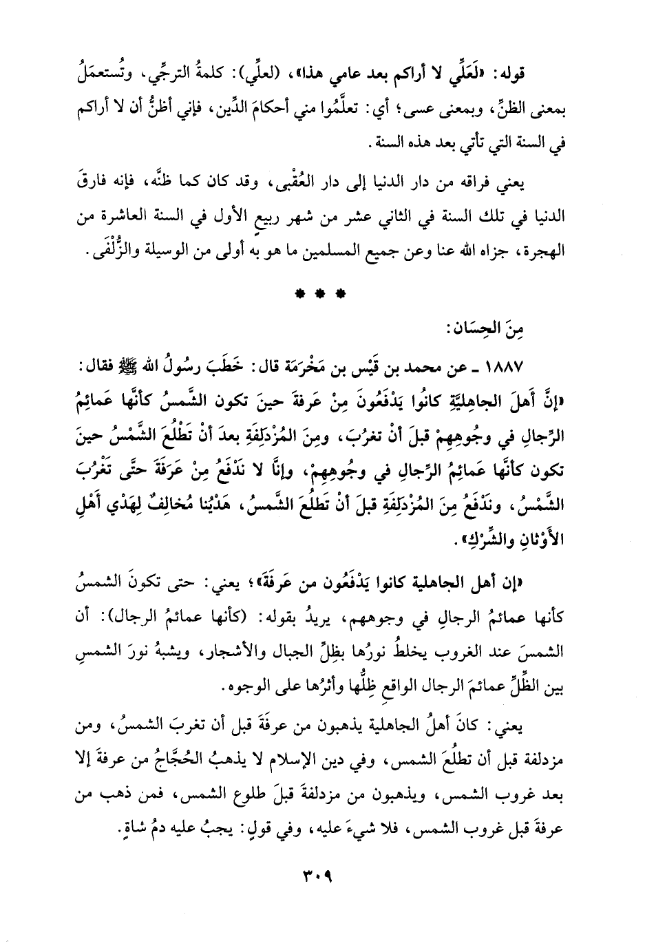 1887 - عن محمد بن قَيْس بن مَخْرَمَة قال: خَطَبَ رسُولُ الله - صلى الله عليه وسلم - فقال: "إنَّ أَهلَ الجاهِليَّةِ كانُوا يَدْفَعُونَ مِنْ عَرفةَ حينَ تكون الشَّمسُ كأنَّها عَمائِمُ الرِّجالِ في وجُوهِهِمْ قبلَ أنْ تغرُبَ، ومِنَ المُزْدَلِفَةِ بعدَ أنْ تَطْلُعَ الشَّمْسُ حينَ تكون كأنَّها عَمائِمُ الرِّجالِ في وجُوهِهِمْ، وإنَّا لا نَدْفَعُ مِنْ عَرَفَةَ حتَّى تَغْرُبَ الشَّمْسُ، ونَدْفَعُ مِنَ المُزْدَلِفَةِ قبلَ أنْ تَطلُعَ الشَّمسُ، هَدْيُنا مُخالِفٌ لِهَدْي أَهْلِ الأَوْثانِ والشِّرْكِ".